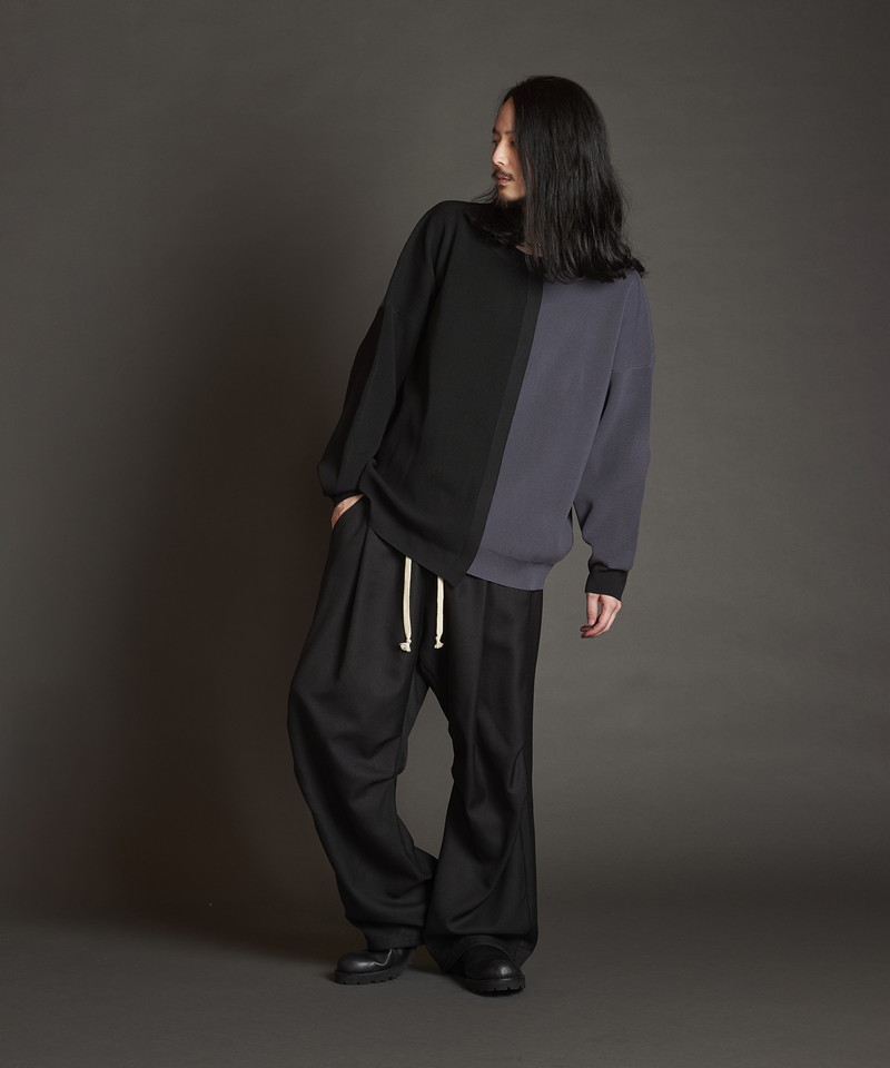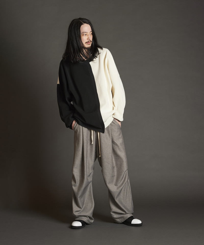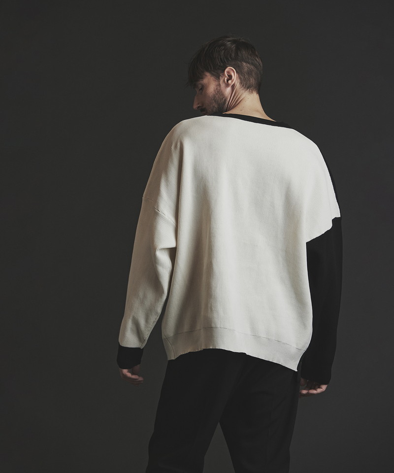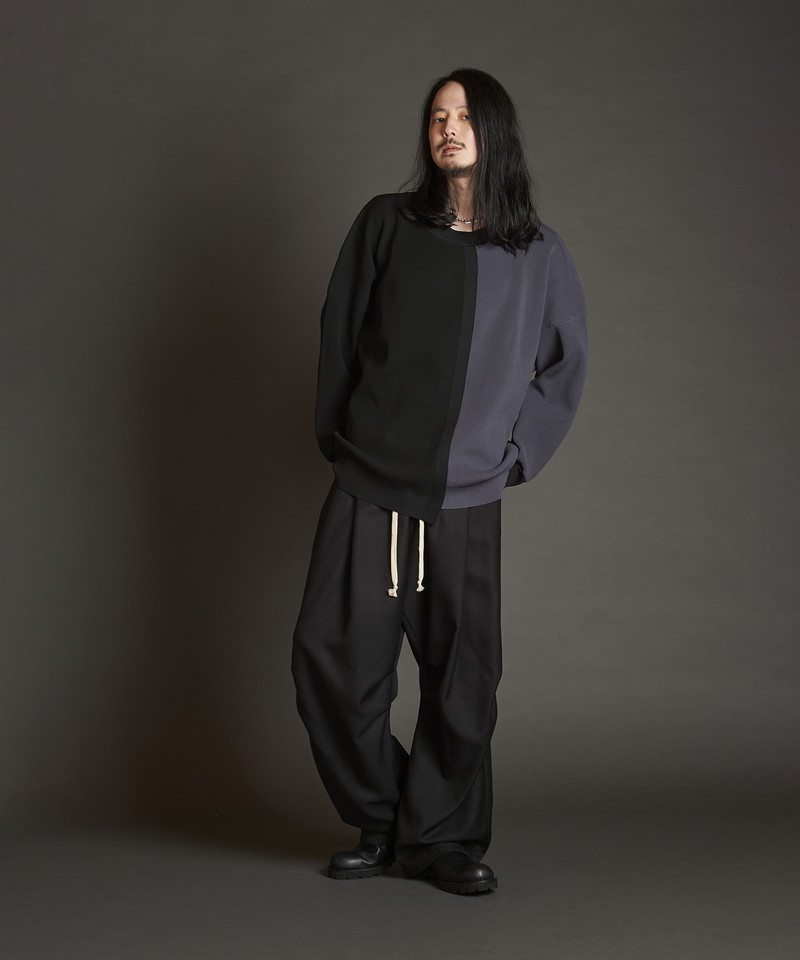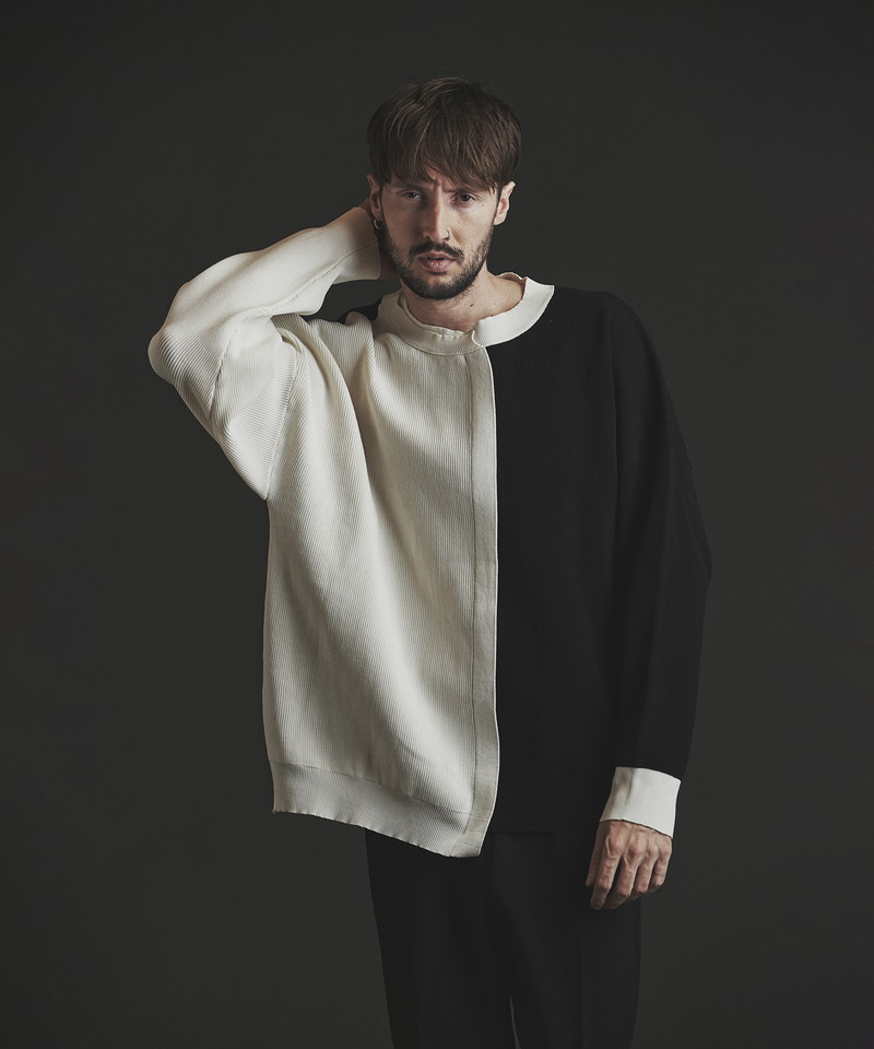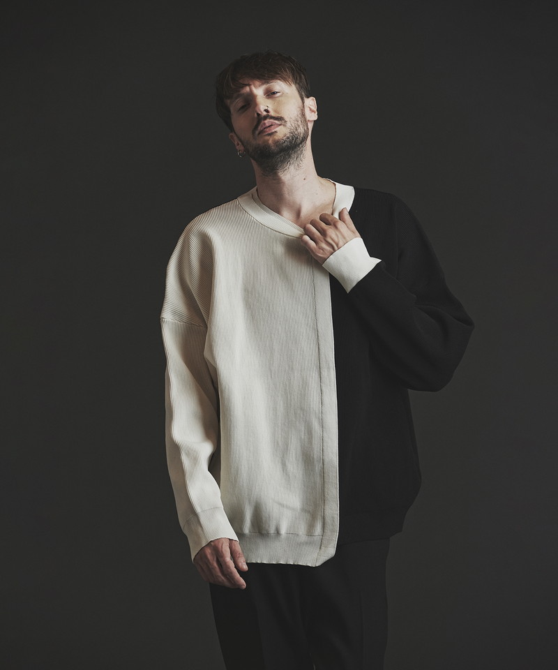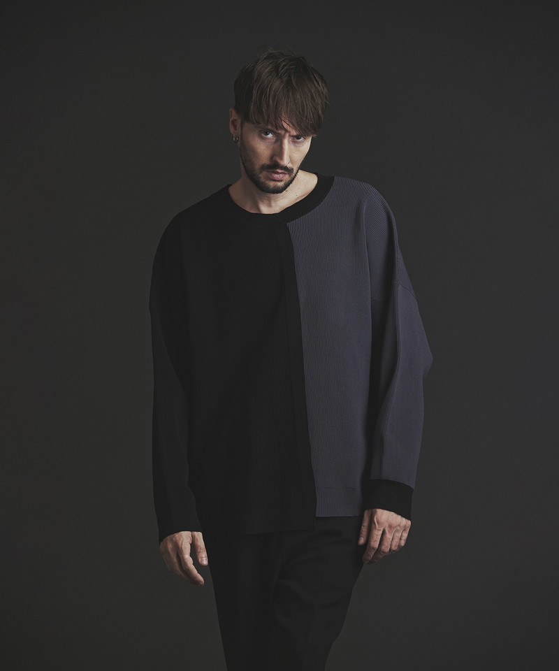 アシンメトリーなレイヤードデザインとバイカラーの切替が目を引くBIGニットプルオーバー。