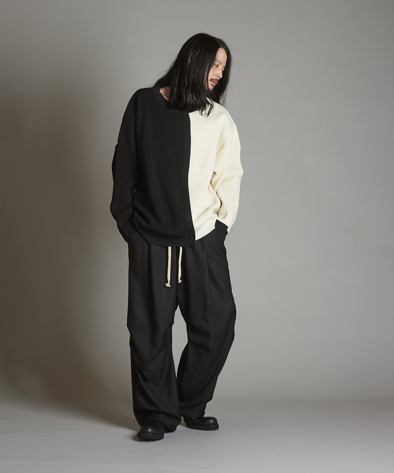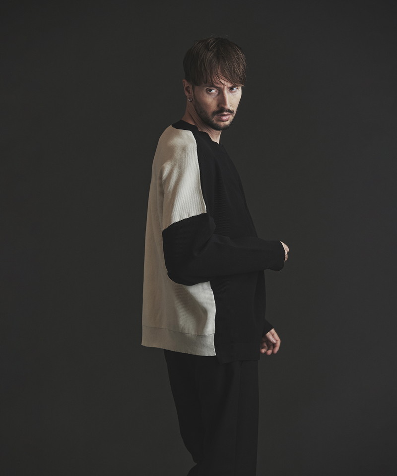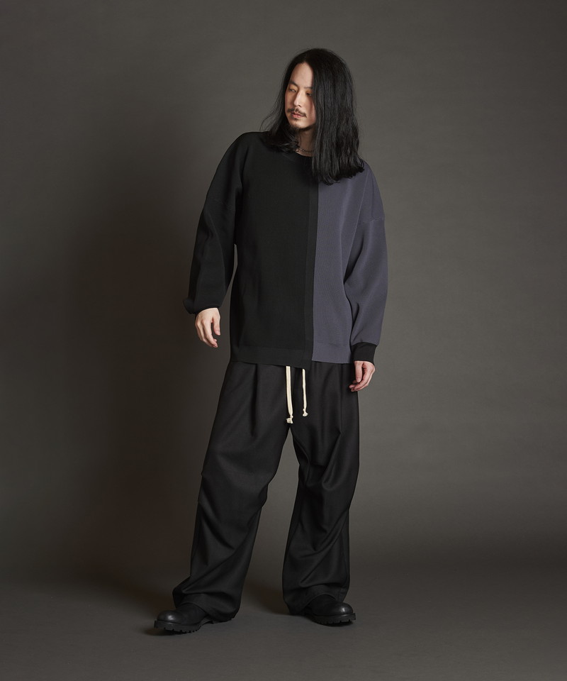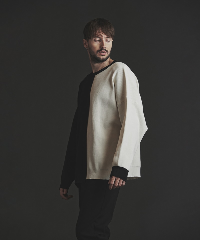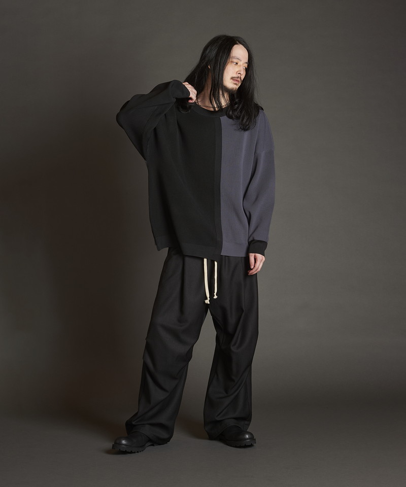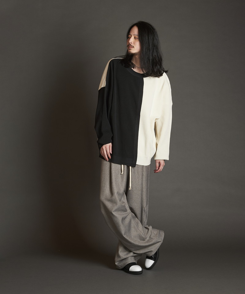 アシンメトリーなレイヤードデザインとバイカラーの切替が目を引くBIGニットプルオーバー。