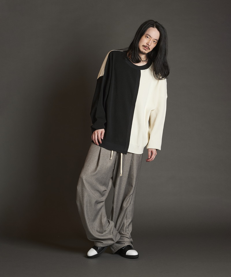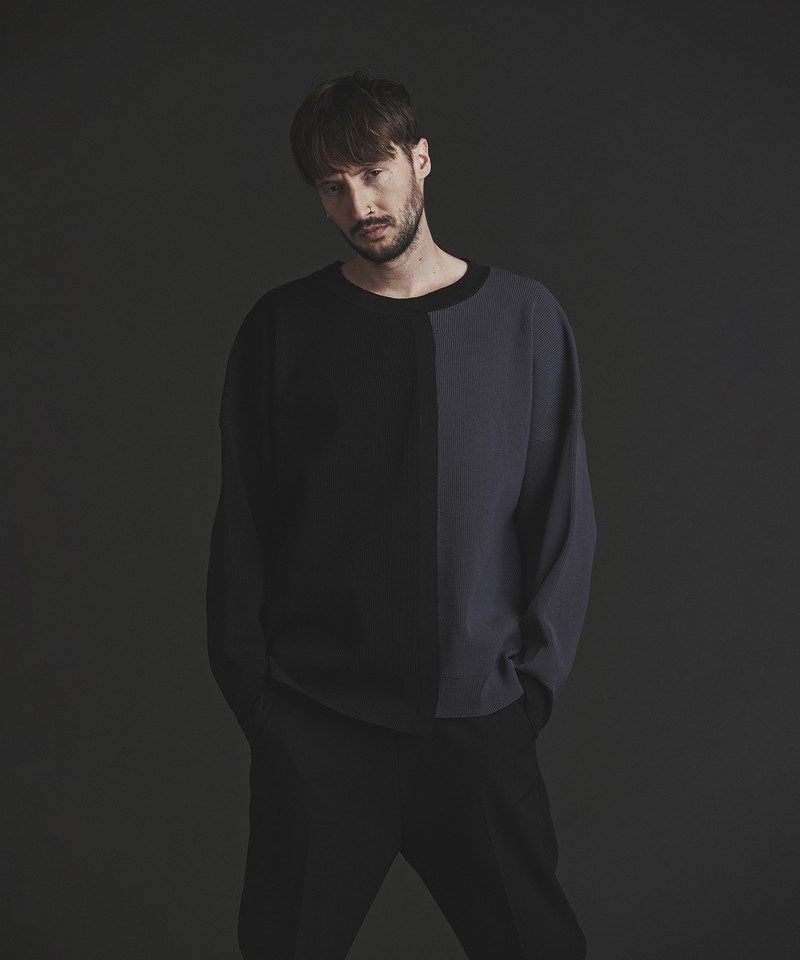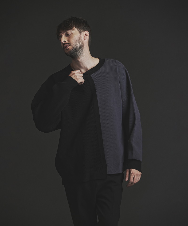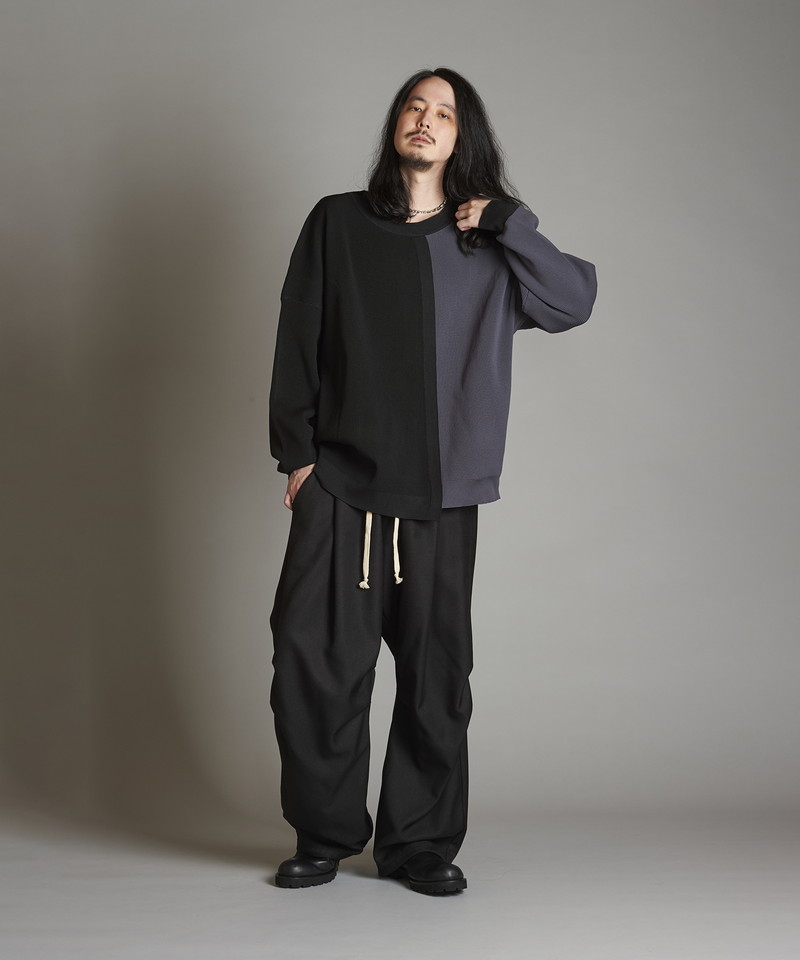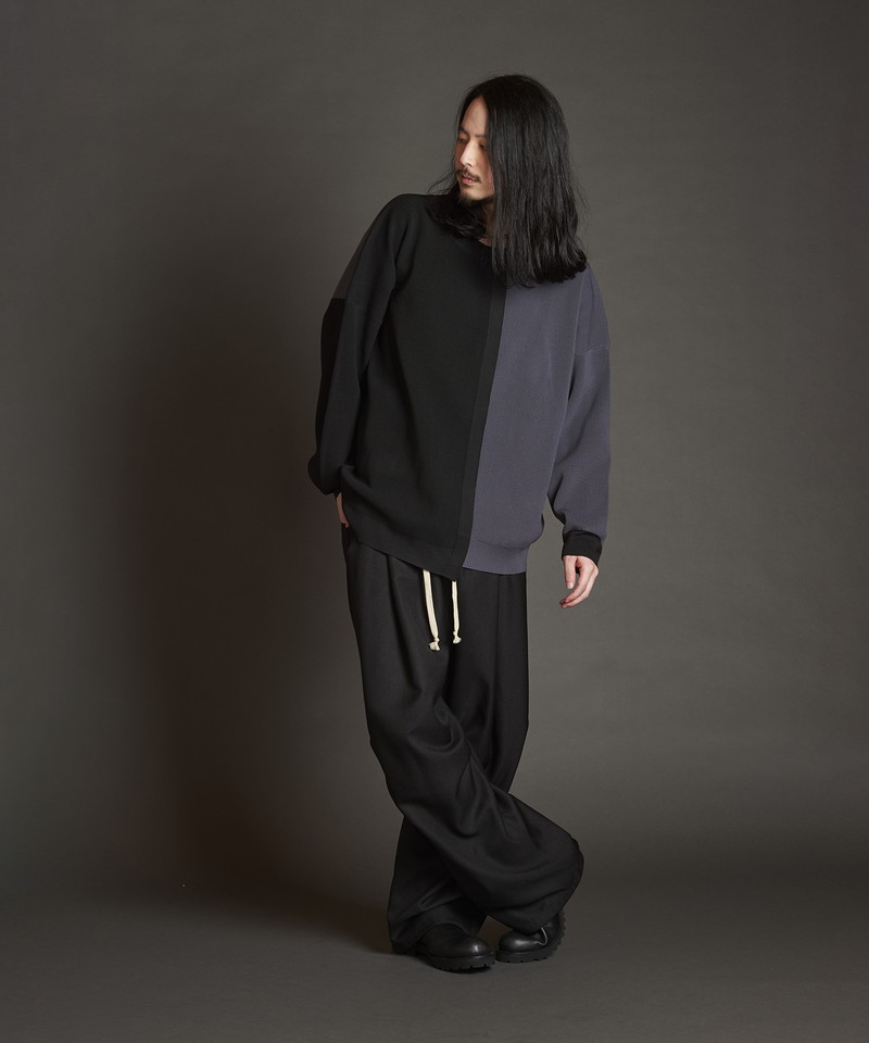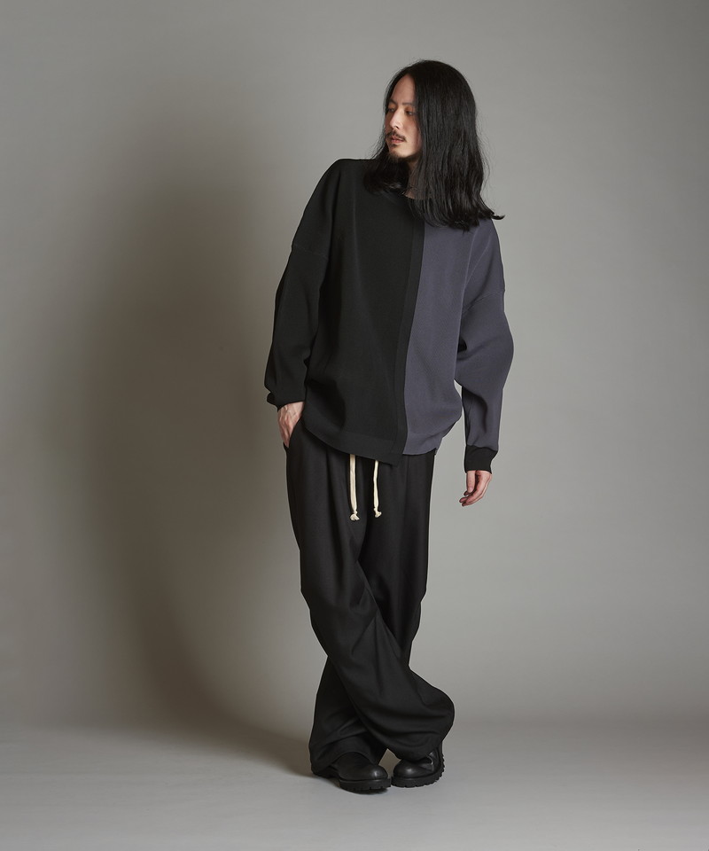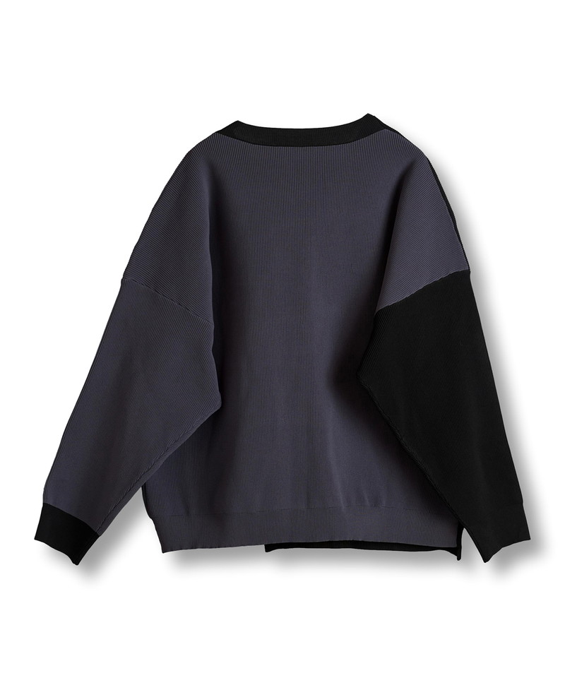 アシンメトリーなレイヤードデザインとバイカラーの切替が目を引くBIGニットプルオーバー。