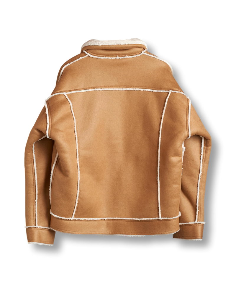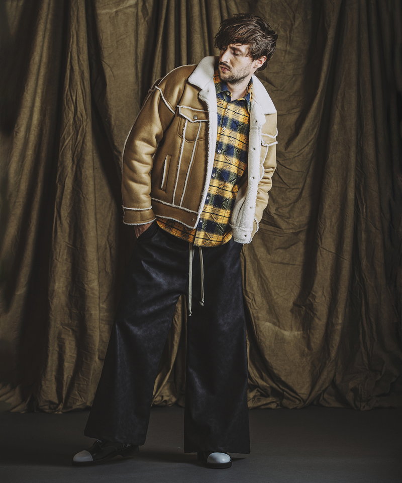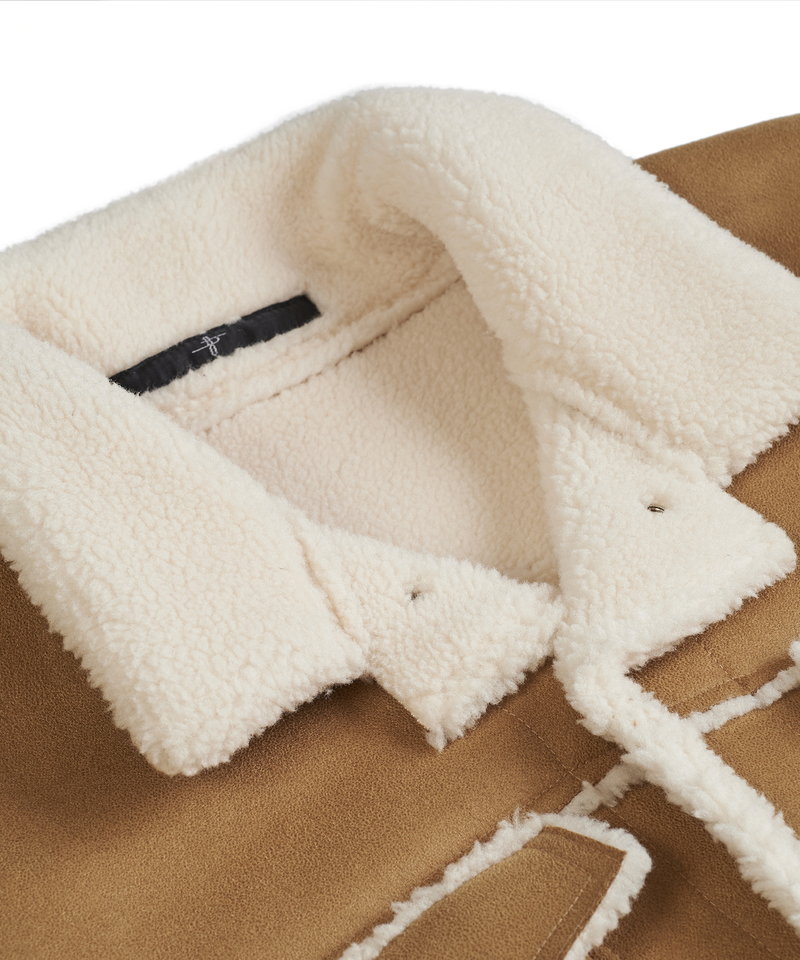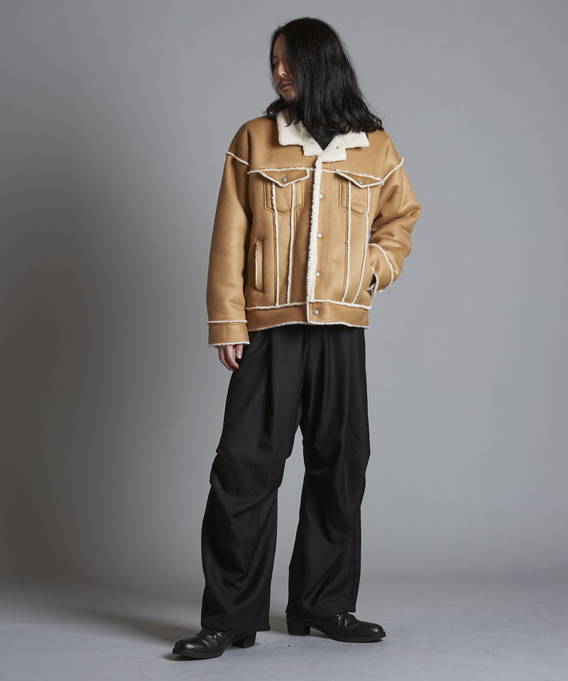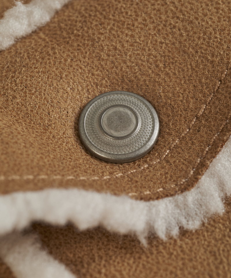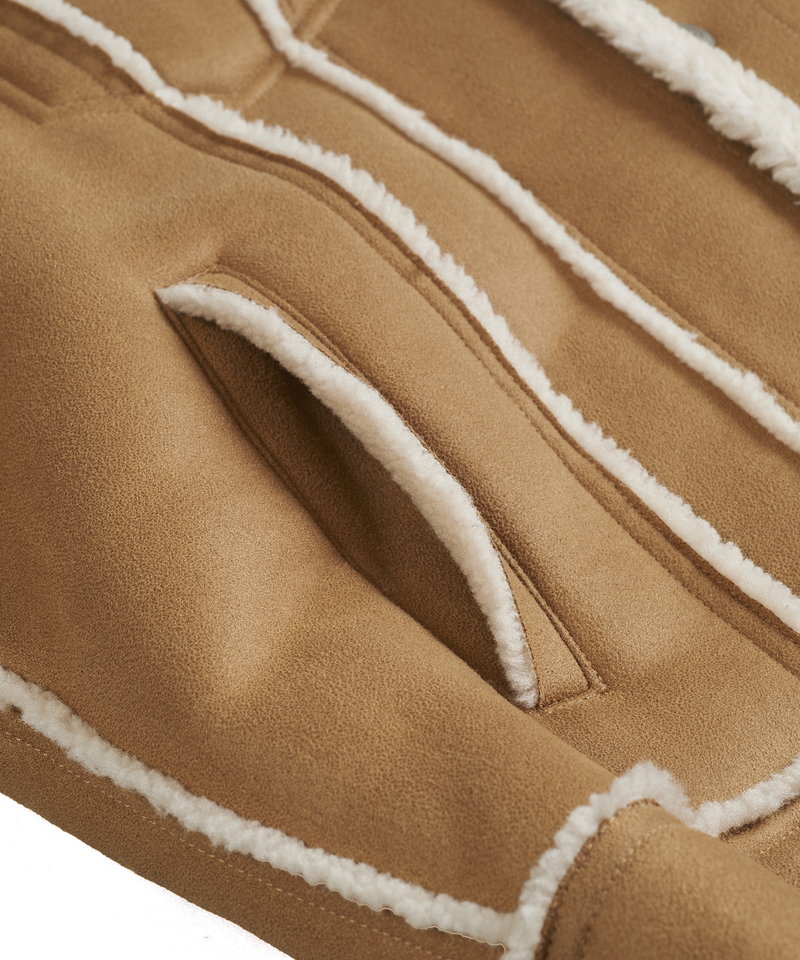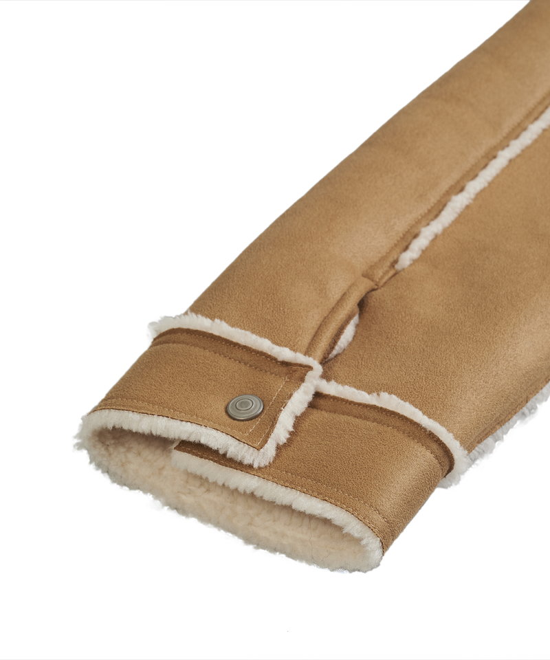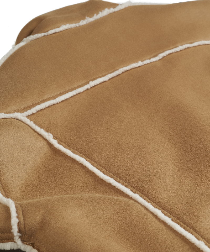 表地にはしなやかな質感のフェイクスエード、裏側には柔らかく肌当たりの良いボア素材をボンディングしたリアルな雰囲気のフェイクムートン生地を採用。