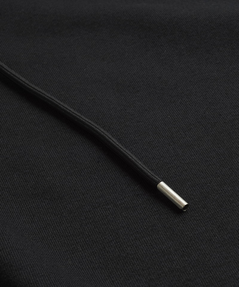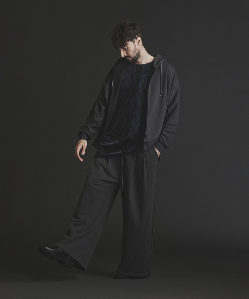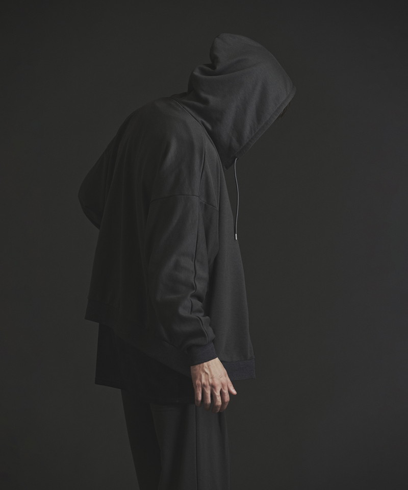 ダークトーンな色使いと特徴的なシルエットでカジュアルな印象の強い裏毛パーカをモードにアップデートした一着となっている。