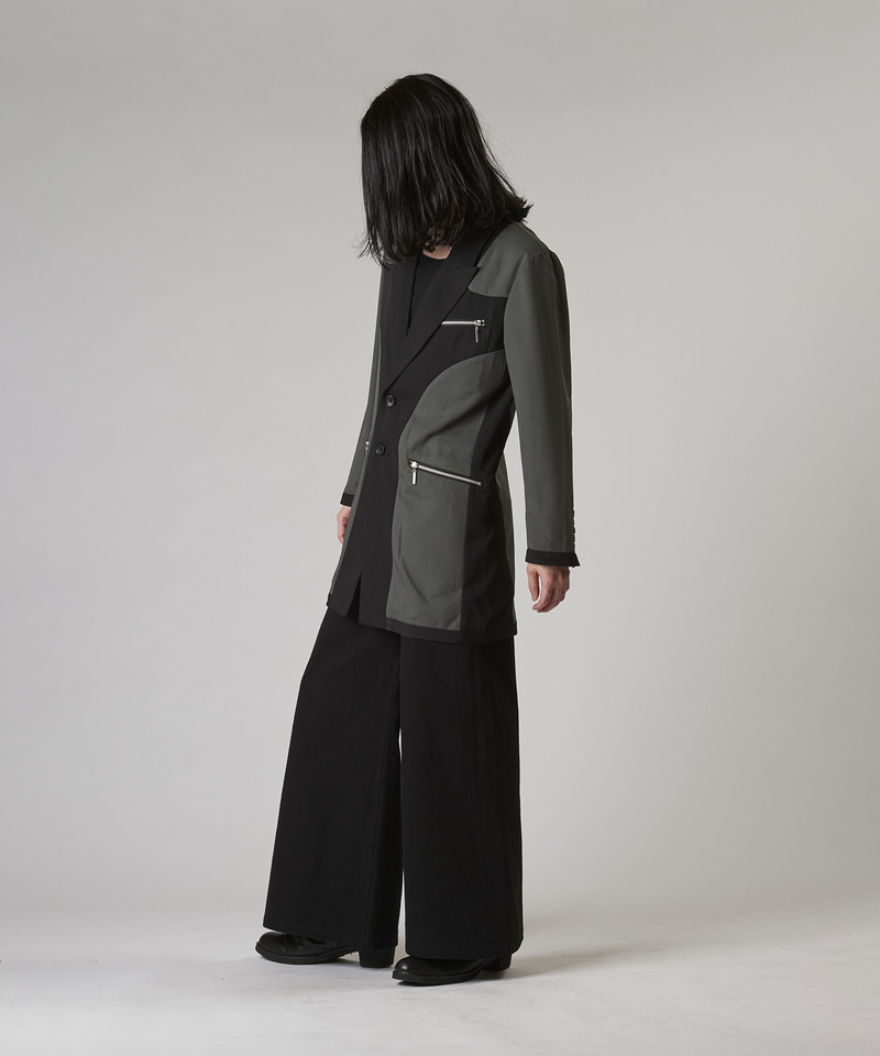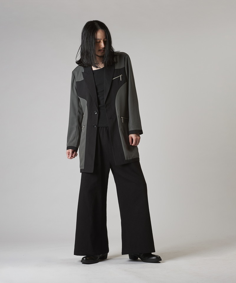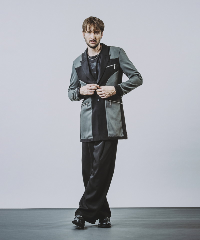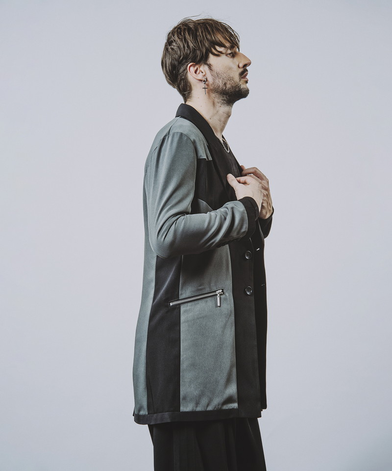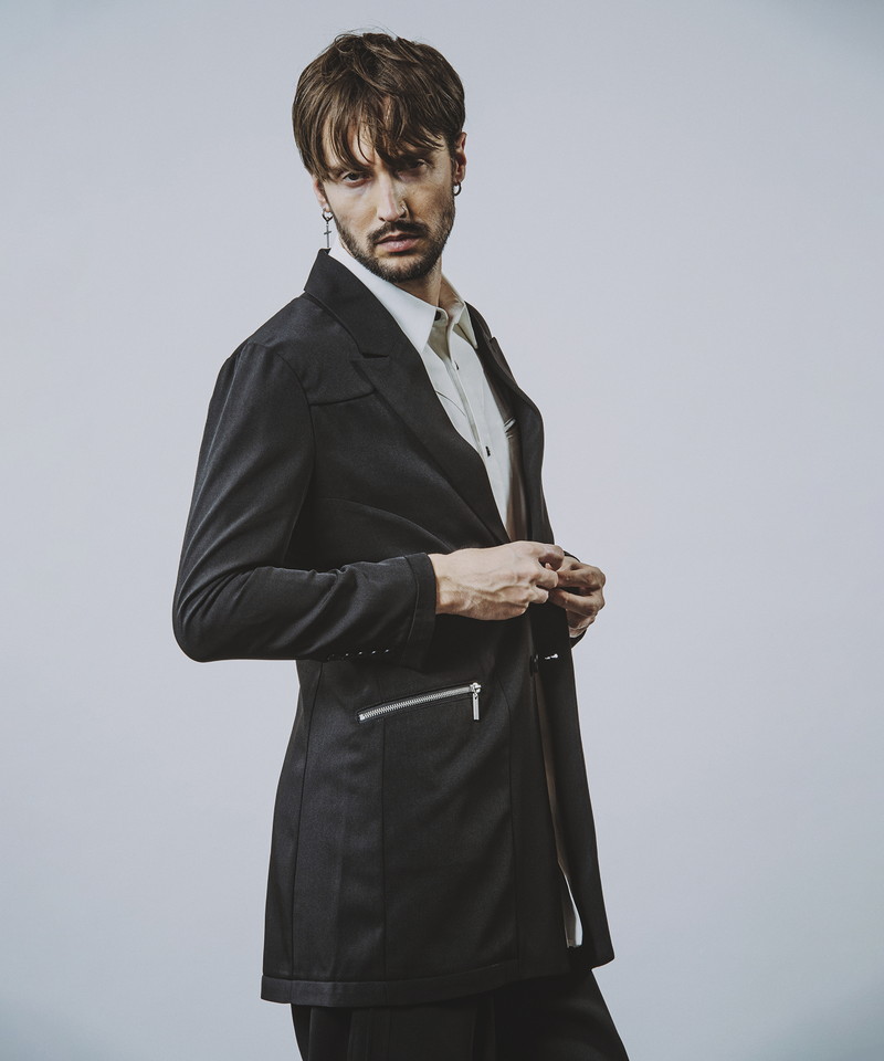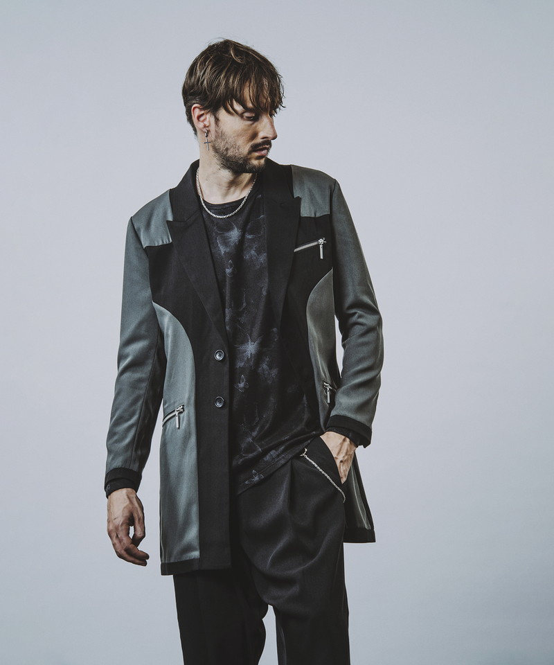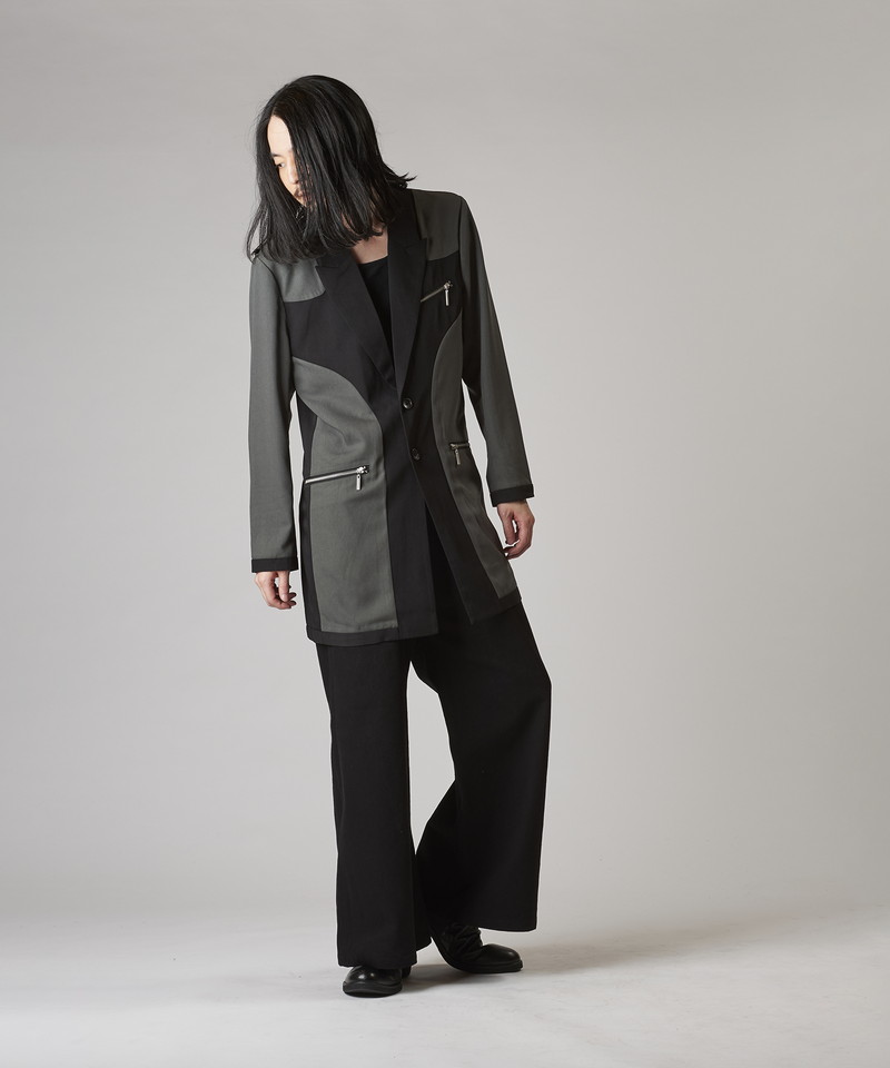 ロングタイプの2Bジャケット。身頃の湾曲した切替デザイン。共地切替で馴染み良く仕上げたインサイドアウトデザイン。袖口や裾に至るまで、裏側の仕様を表側に取り入れつつも、違和感なく魅せる絶妙に足し引きされたデザイン。アクセントのZIPポケットとシャープなフォルム。インサイドアウトのデザインがより映えるバイカラー仕様のMIXカラー。サイドラインワイドトラウザーズとのセットアップ着用が可能。