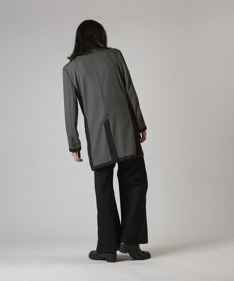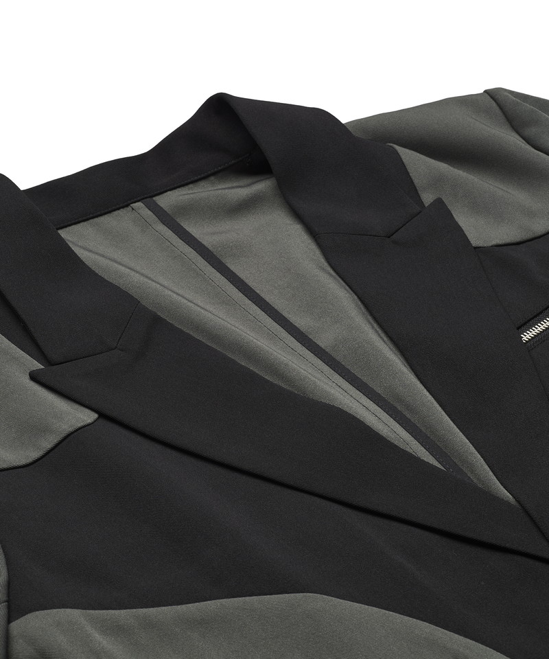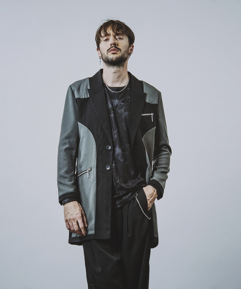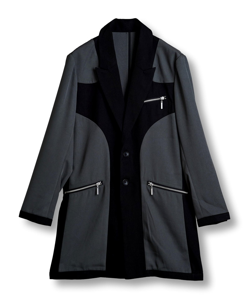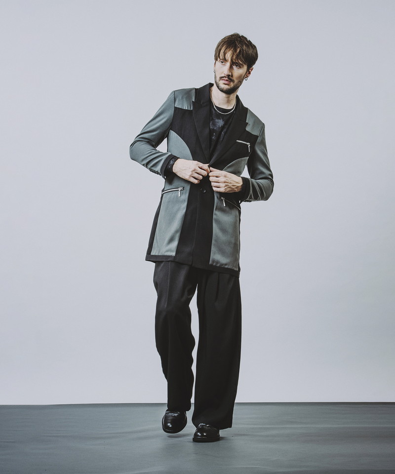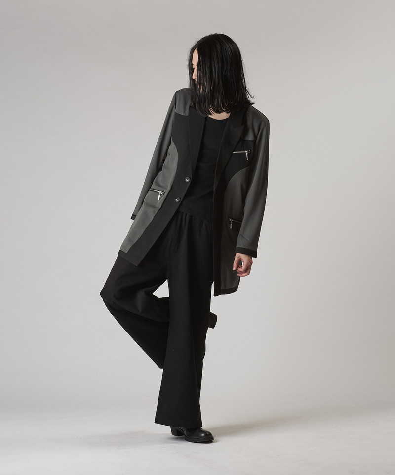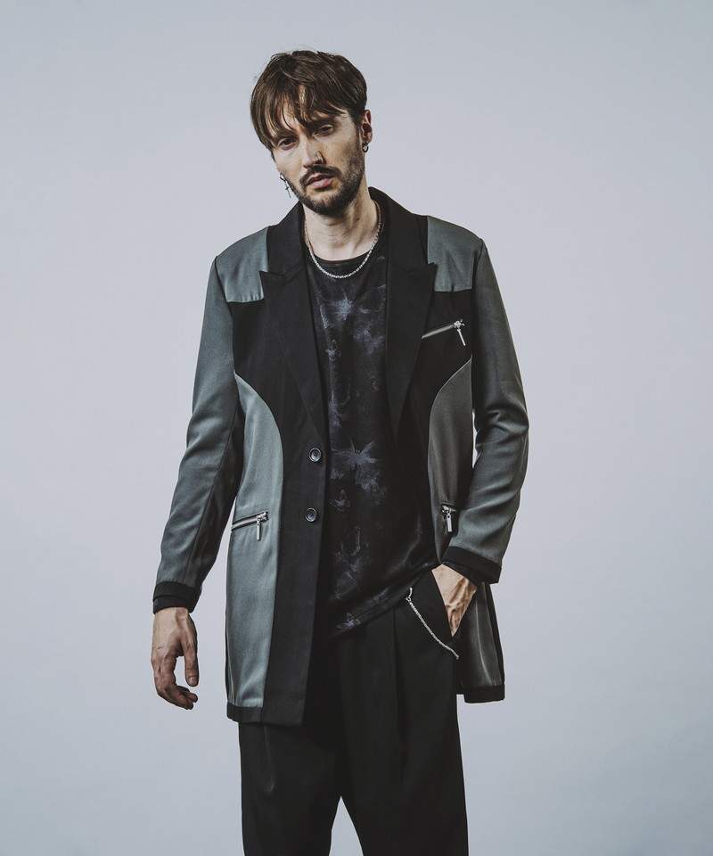 ロングタイプの2Bジャケット。身頃の湾曲した切替デザイン。共地切替で馴染み良く仕上げたインサイドアウトデザイン。袖口や裾に至るまで、裏側の仕様を表側に取り入れつつも、違和感なく魅せる絶妙に足し引きされたデザイン。アクセントのZIPポケットとシャープなフォルム。インサイドアウトのデザインがより映えるバイカラー仕様のMIXカラー。サイドラインワイドトラウザーズとのセットアップ着用が可能。
