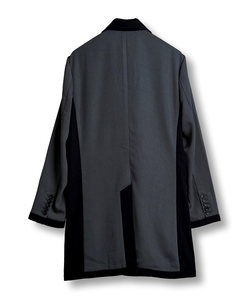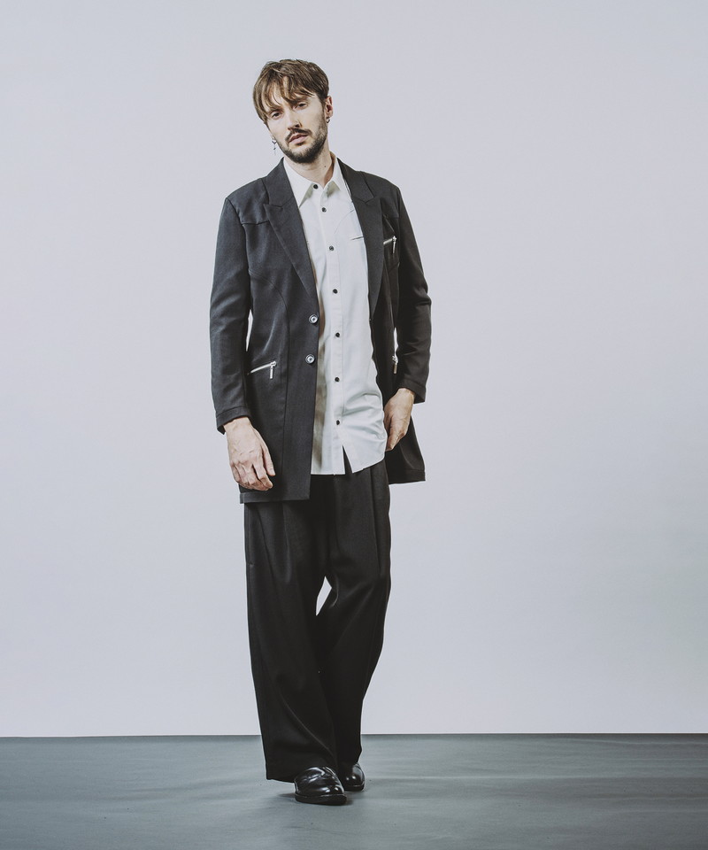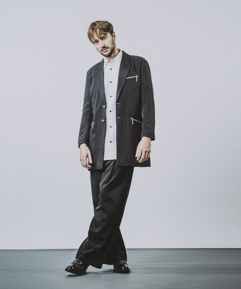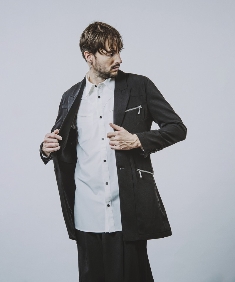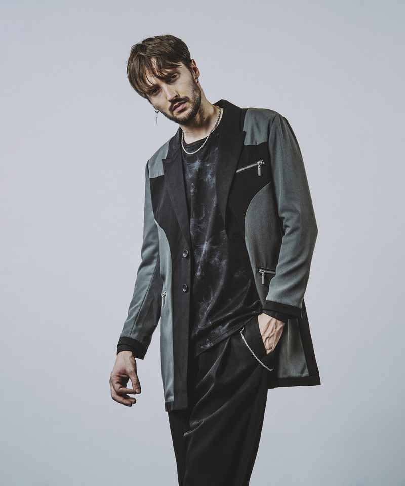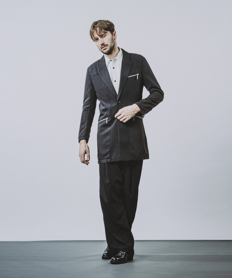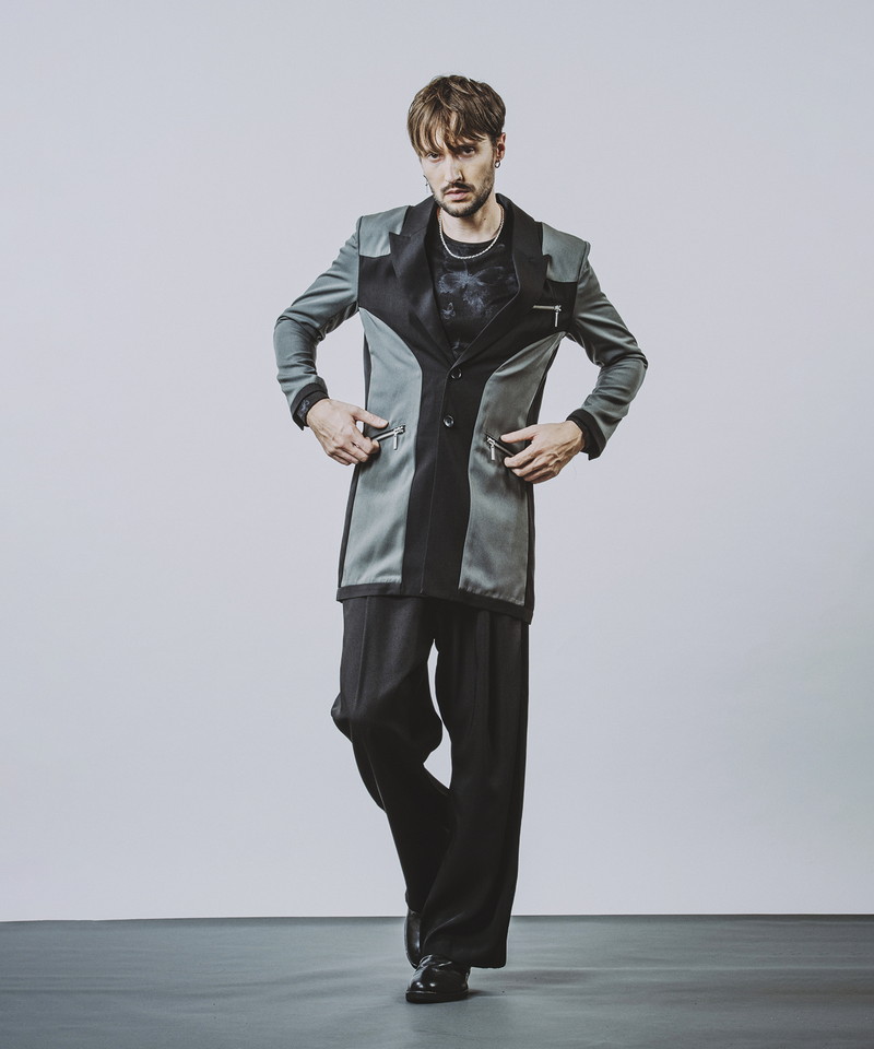 ロングタイプの2Bジャケット。身頃の湾曲した切替デザイン。共地切替で馴染み良く仕上げたインサイドアウトデザイン。袖口や裾に至るまで、裏側の仕様を表側に取り入れつつも、違和感なく魅せる絶妙に足し引きされたデザイン。アクセントのZIPポケットとシャープなフォルム。インサイドアウトのデザインがより映えるバイカラー仕様のMIXカラー。サイドラインワイドトラウザーズとのセットアップ着用が可能。