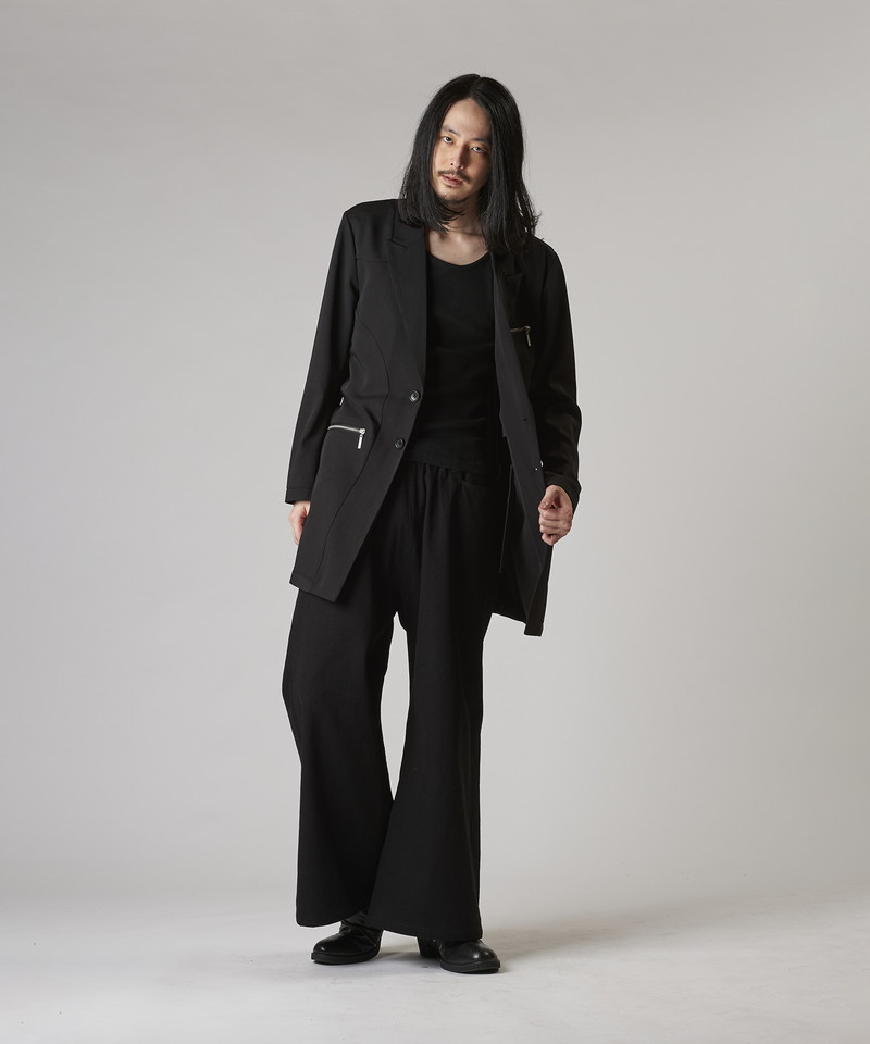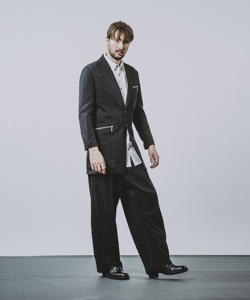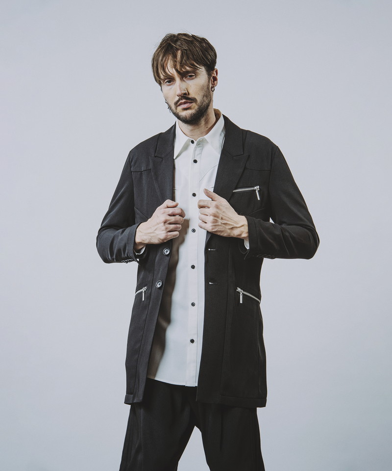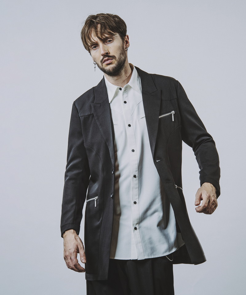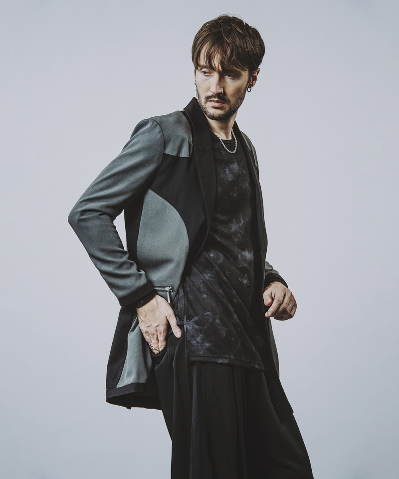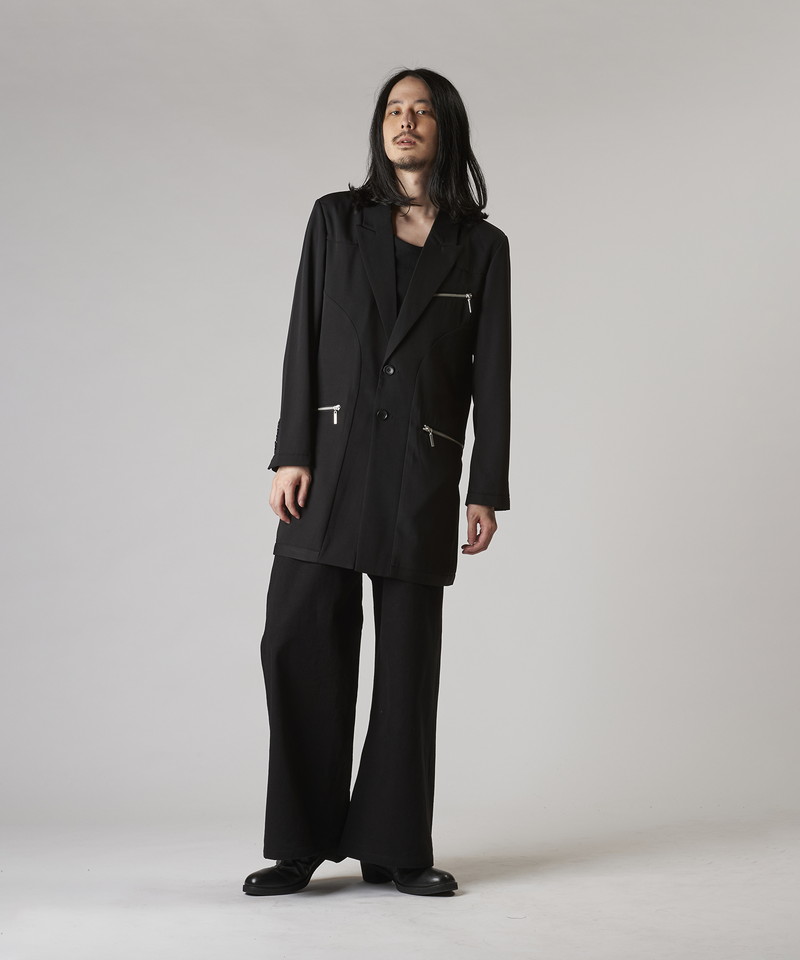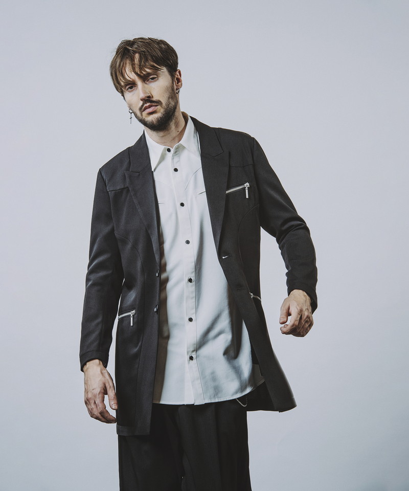ロングタイプの2Bジャケット。身頃の湾曲した切替デザイン。共地切替で馴染み良く仕上げたインサイドアウトデザイン。袖口や裾に至るまで、裏側の仕様を表側に取り入れつつも、違和感なく魅せる絶妙に足し引きされたデザイン。アクセントのZIPポケットとシャープなフォルム。インサイドアウトのデザインがより映えるバイカラー仕様のMIXカラー。サイドラインワイドトラウザーズとのセットアップ着用が可能。