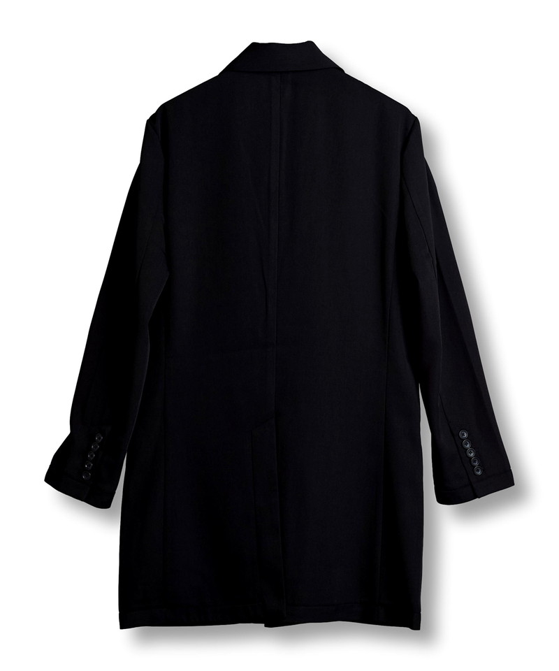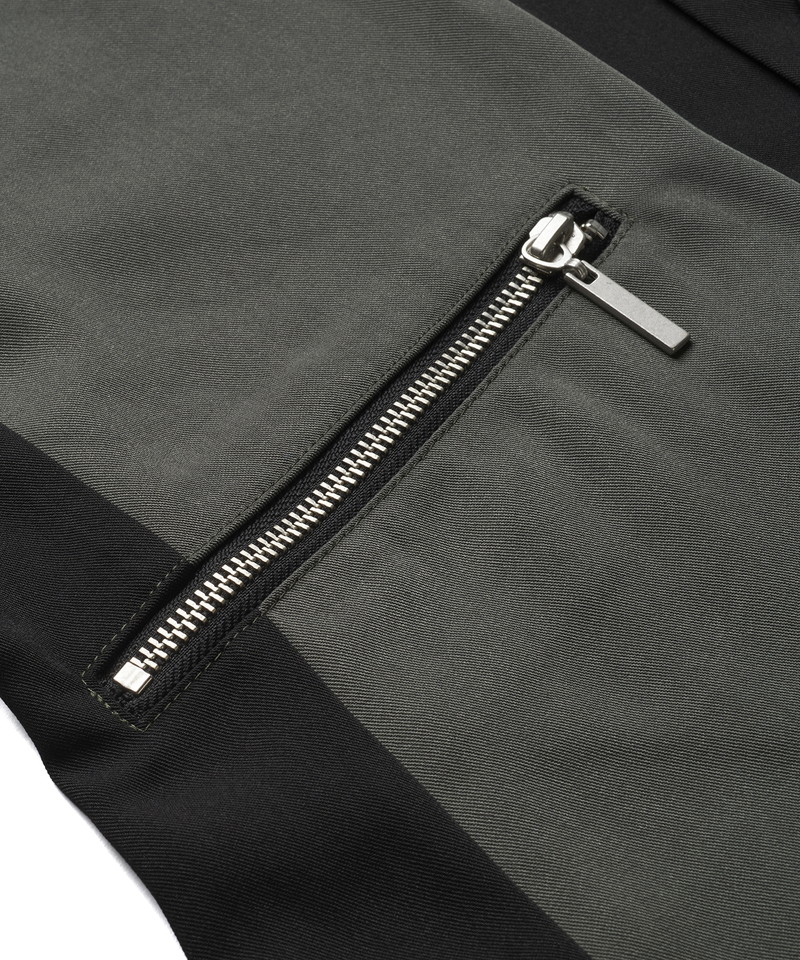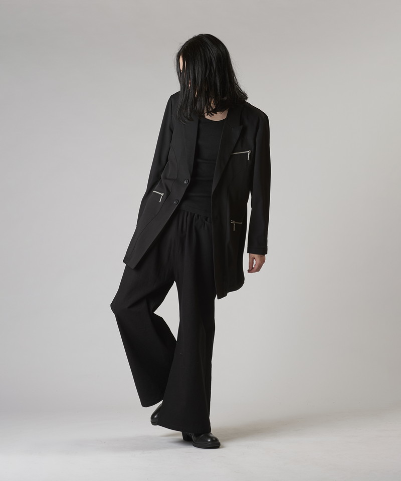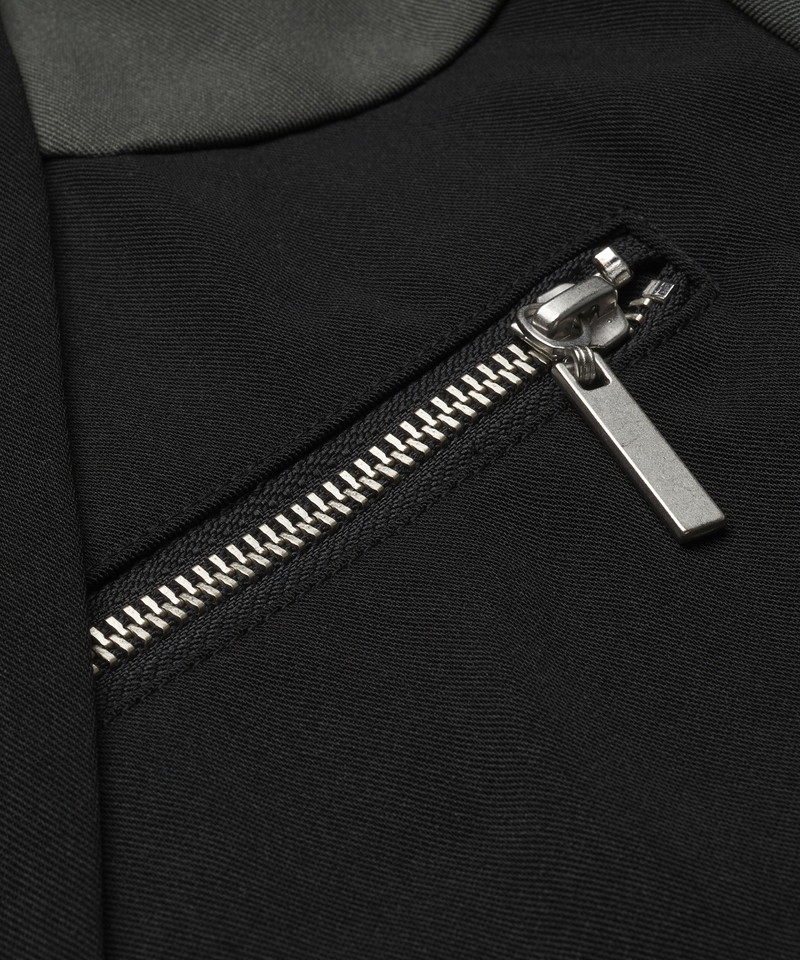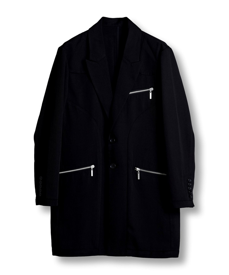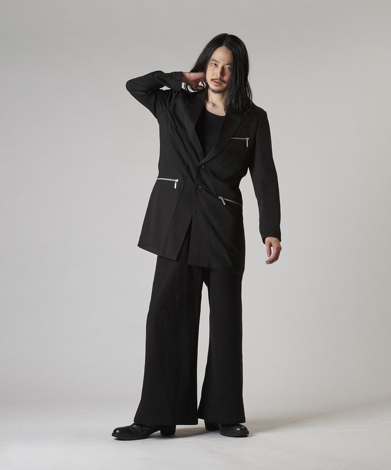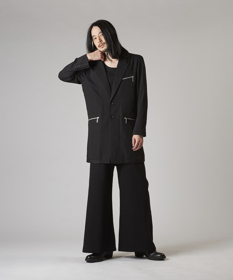 ロングタイプの2Bジャケット。身頃の湾曲した切替デザイン。共地切替で馴染み良く仕上げたインサイドアウトデザイン。袖口や裾に至るまで、裏側の仕様を表側に取り入れつつも、違和感なく魅せる絶妙に足し引きされたデザイン。アクセントのZIPポケットとシャープなフォルム。インサイドアウトのデザインがより映えるバイカラー仕様のMIXカラー。サイドラインワイドトラウザーズとのセットアップ着用が可能。