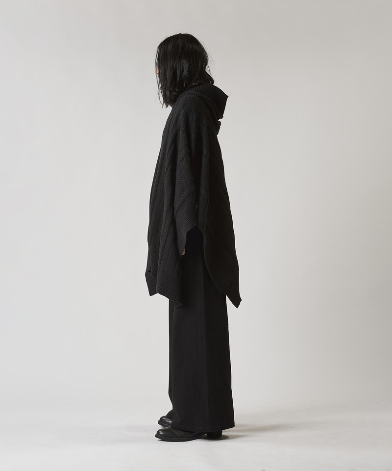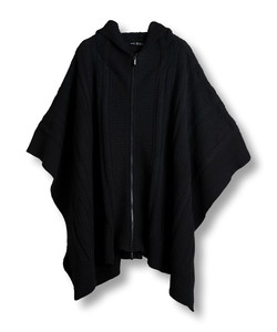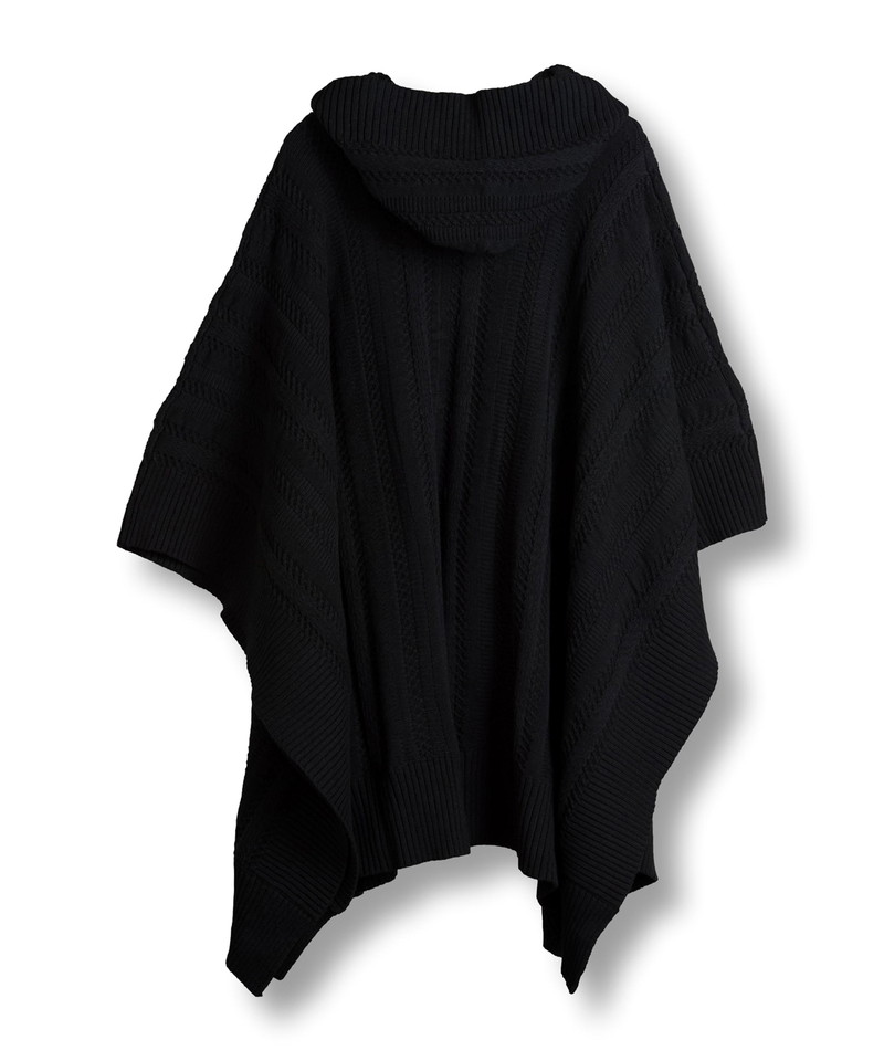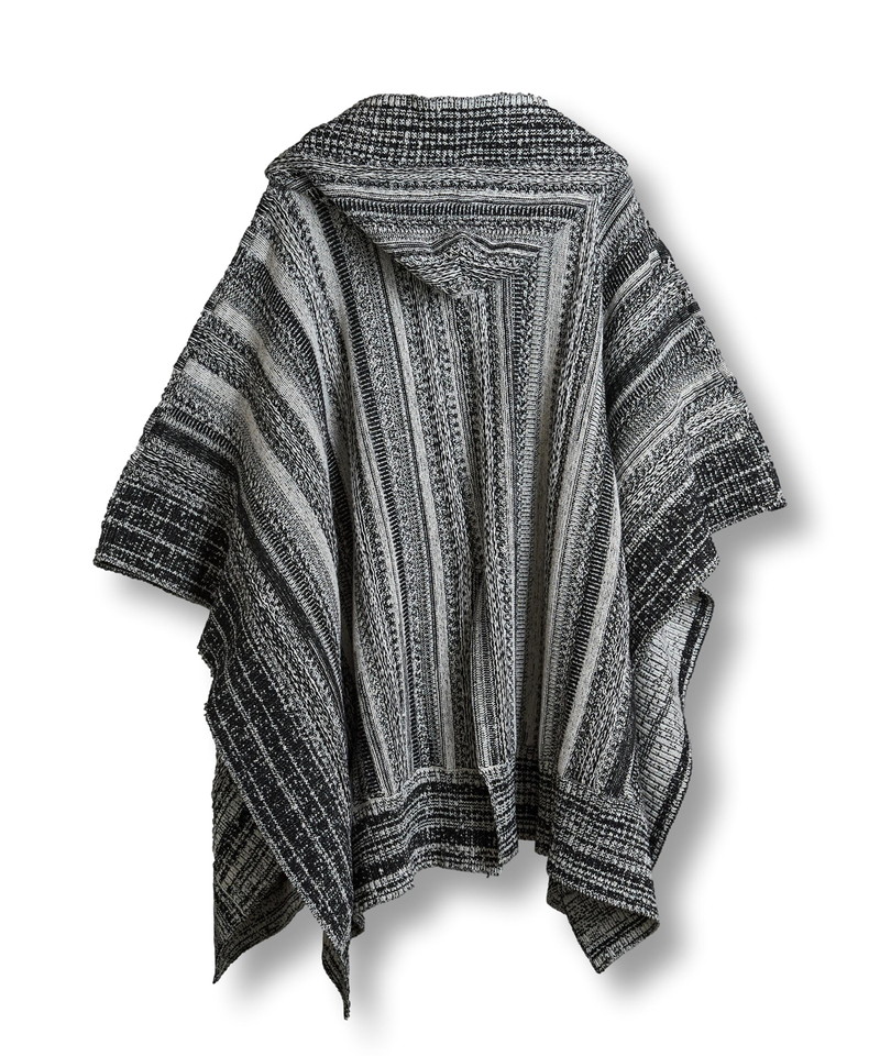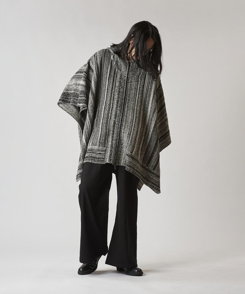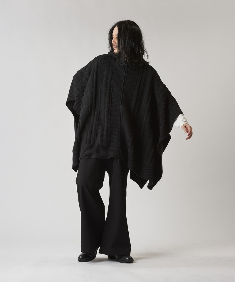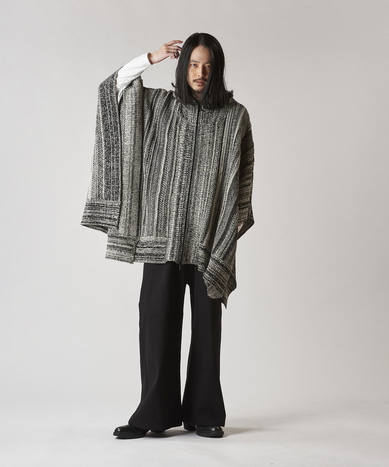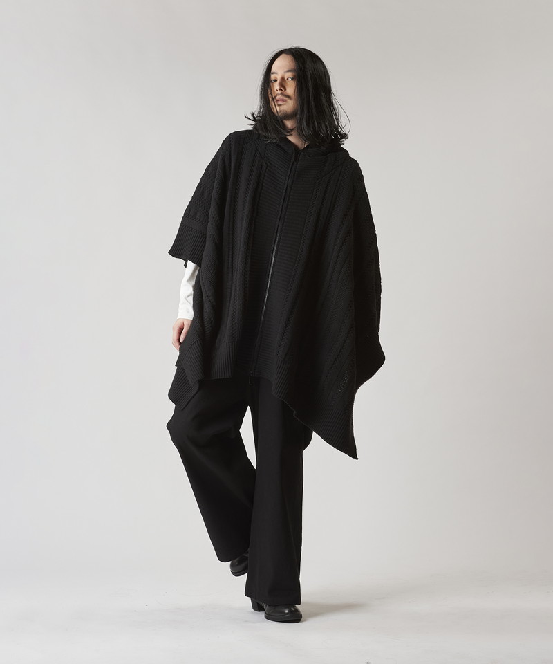 ZIPアップタイプのニットポンチョ。ビッグフードデザインとボリューム感のあるビッグシルエット。あえて横使いでストライプ調にしてシャープな印象をプラスした立体感のある模様編みが特徴。ヘムラインや、ファスナー、フード周りはリブ編みに切替えたデザイン。スタイリングアレンジ可能なダブルファスナー。ジェンダーレスでモードなデザイン。定番人気のシックなBLACKと2色の糸を引き揃えて編み立てたBLACK×WHITEの2カラー展開。