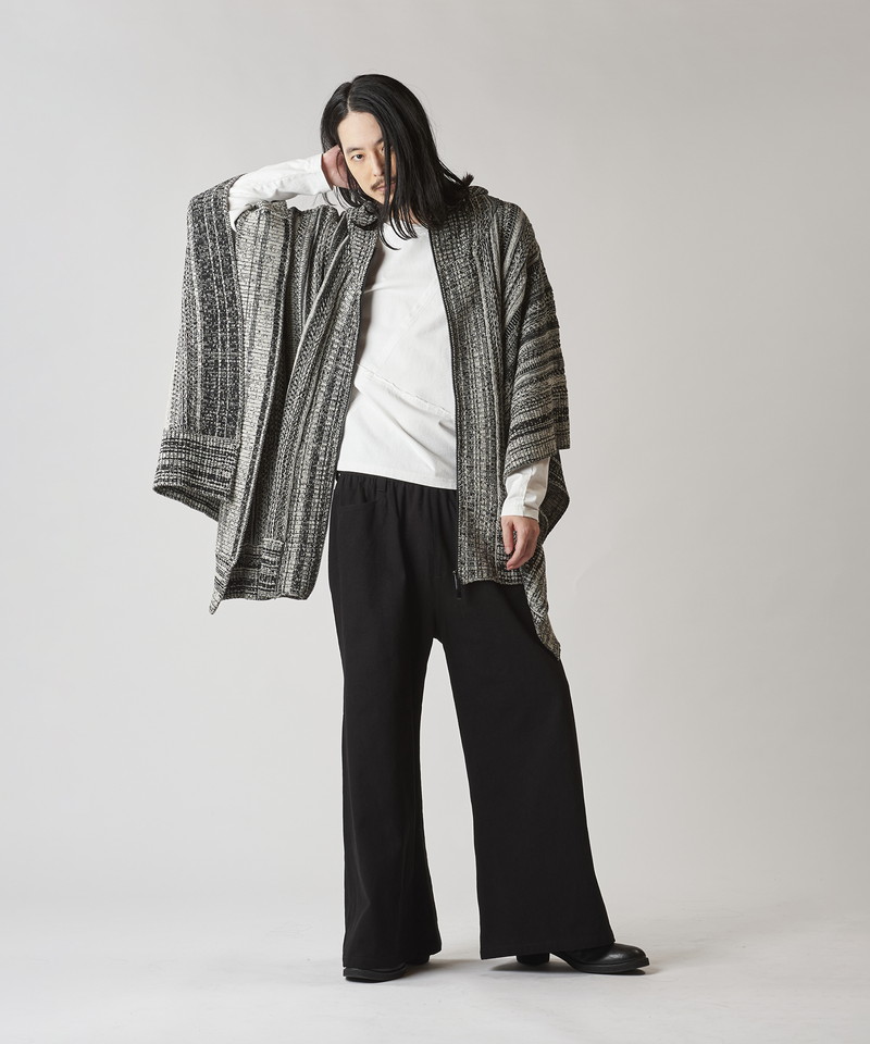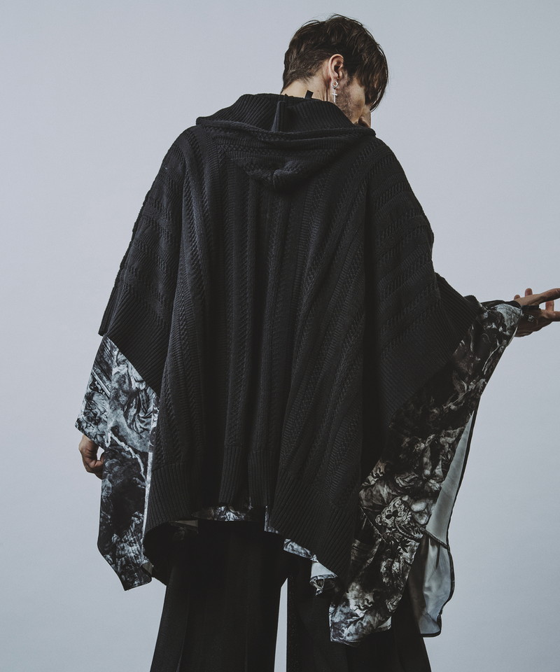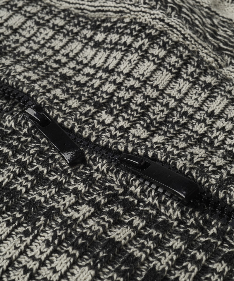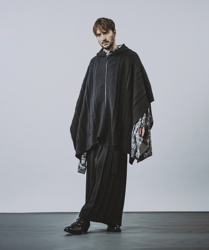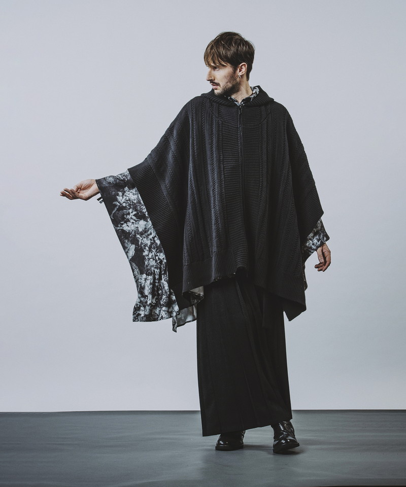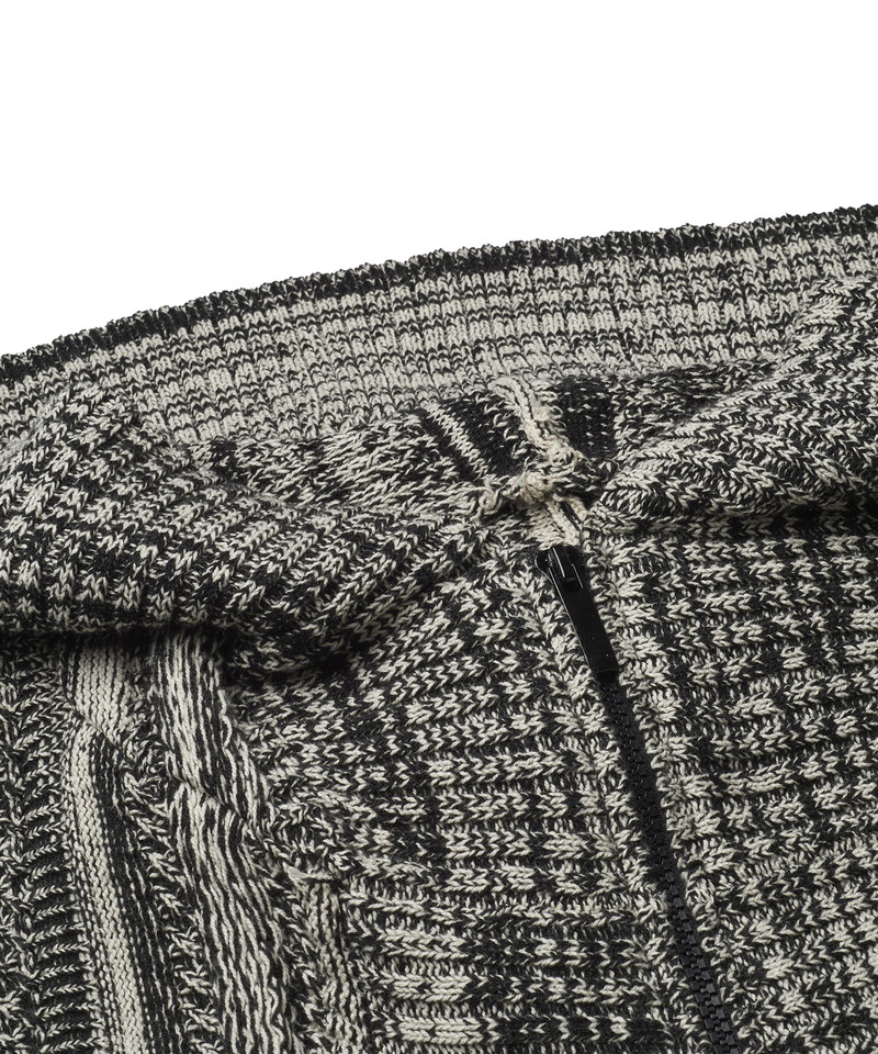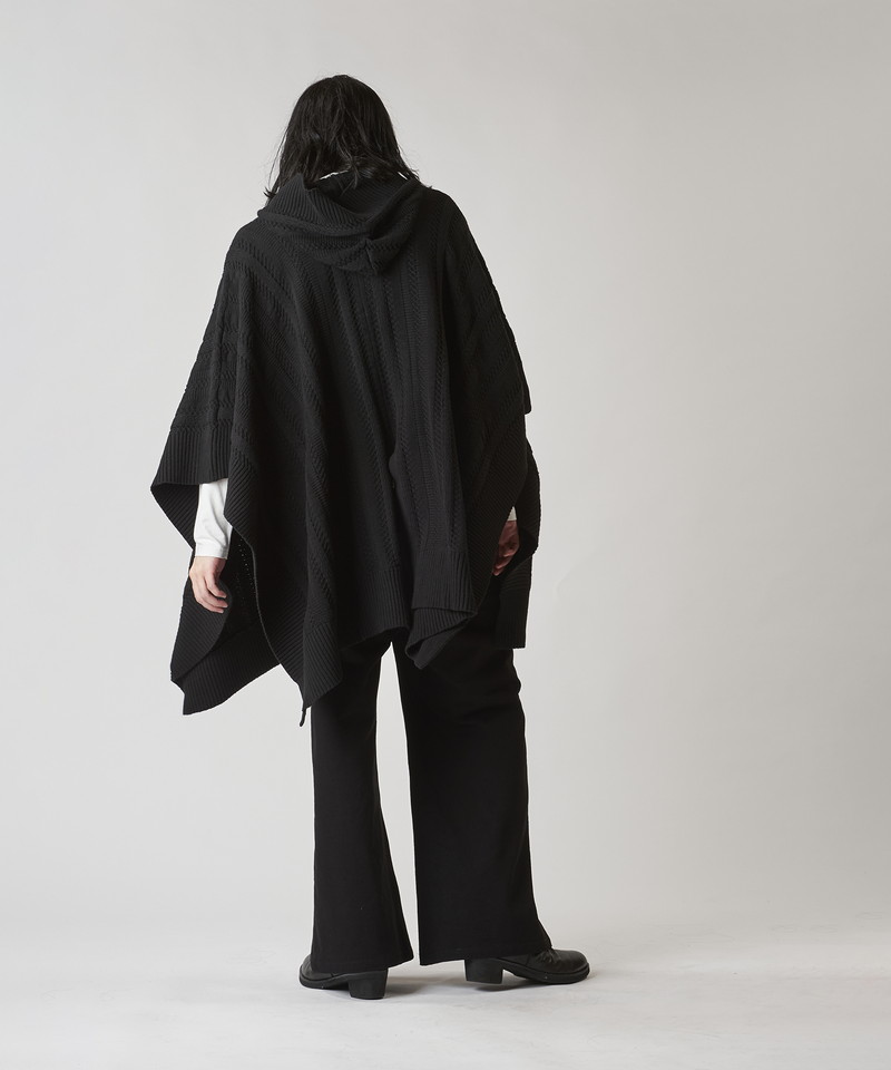 ZIPアップタイプのニットポンチョ。ビッグフードデザインとボリューム感のあるビッグシルエット。あえて横使いでストライプ調にしてシャープな印象をプラスした立体感のある模様編みが特徴。ヘムラインや、ファスナー、フード周りはリブ編みに切替えたデザイン。スタイリングアレンジ可能なダブルファスナー。ジェンダーレスでモードなデザイン。定番人気のシックなBLACKと2色の糸を引き揃えて編み立てたBLACK×WHITEの2カラー展開。