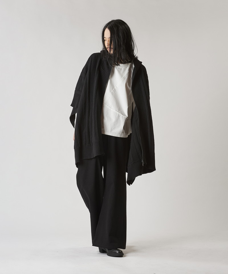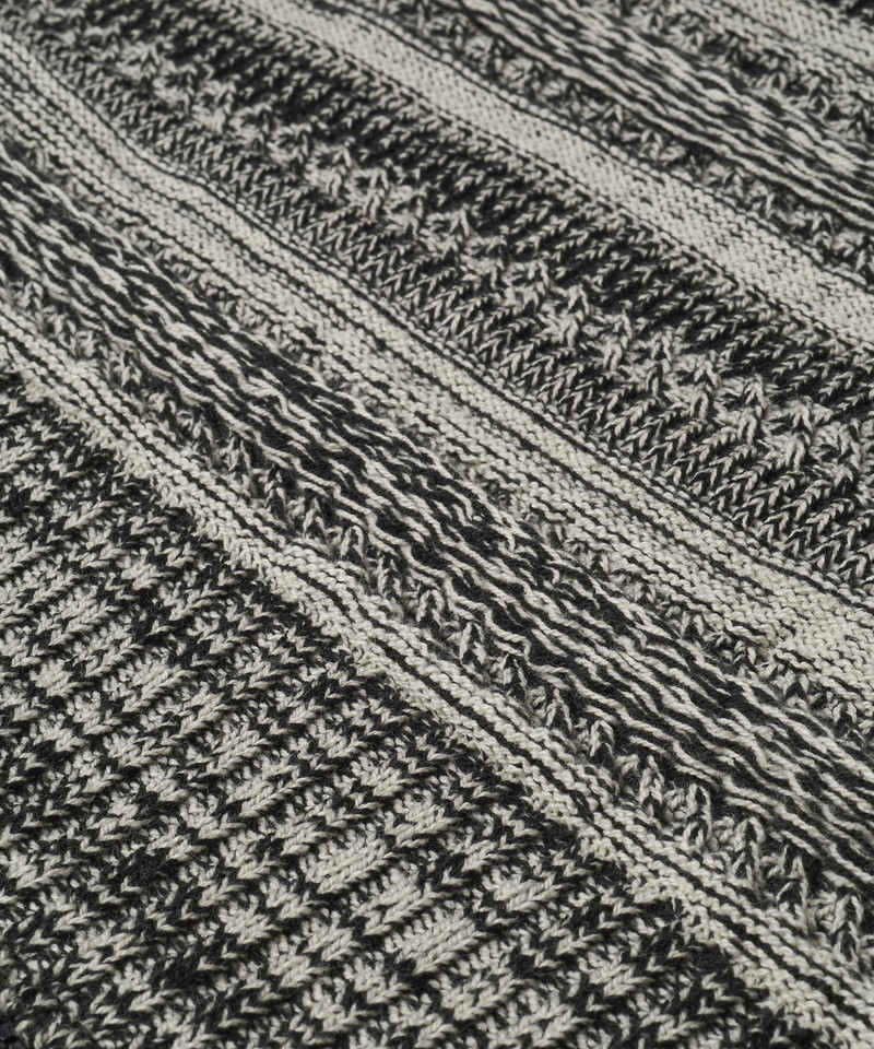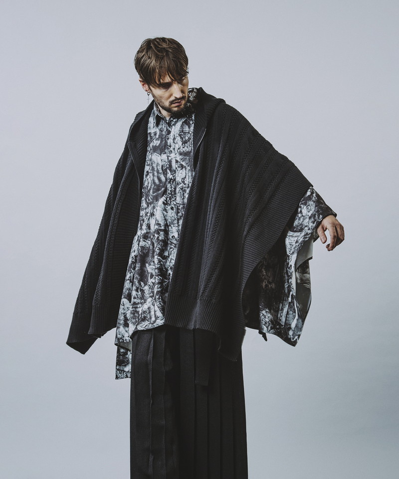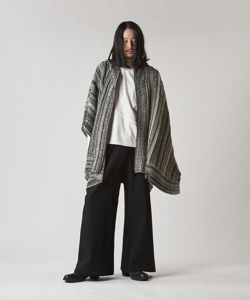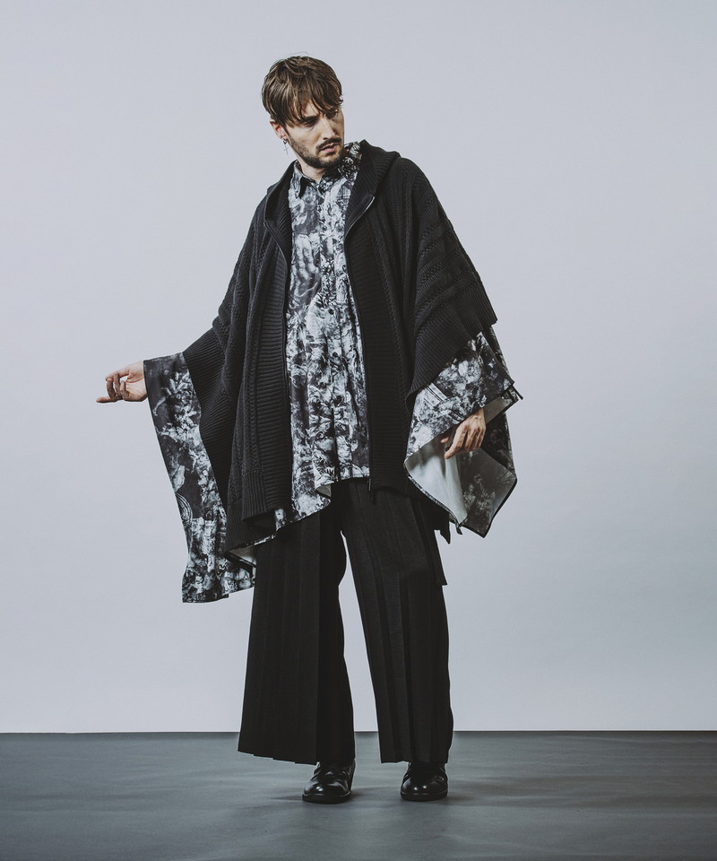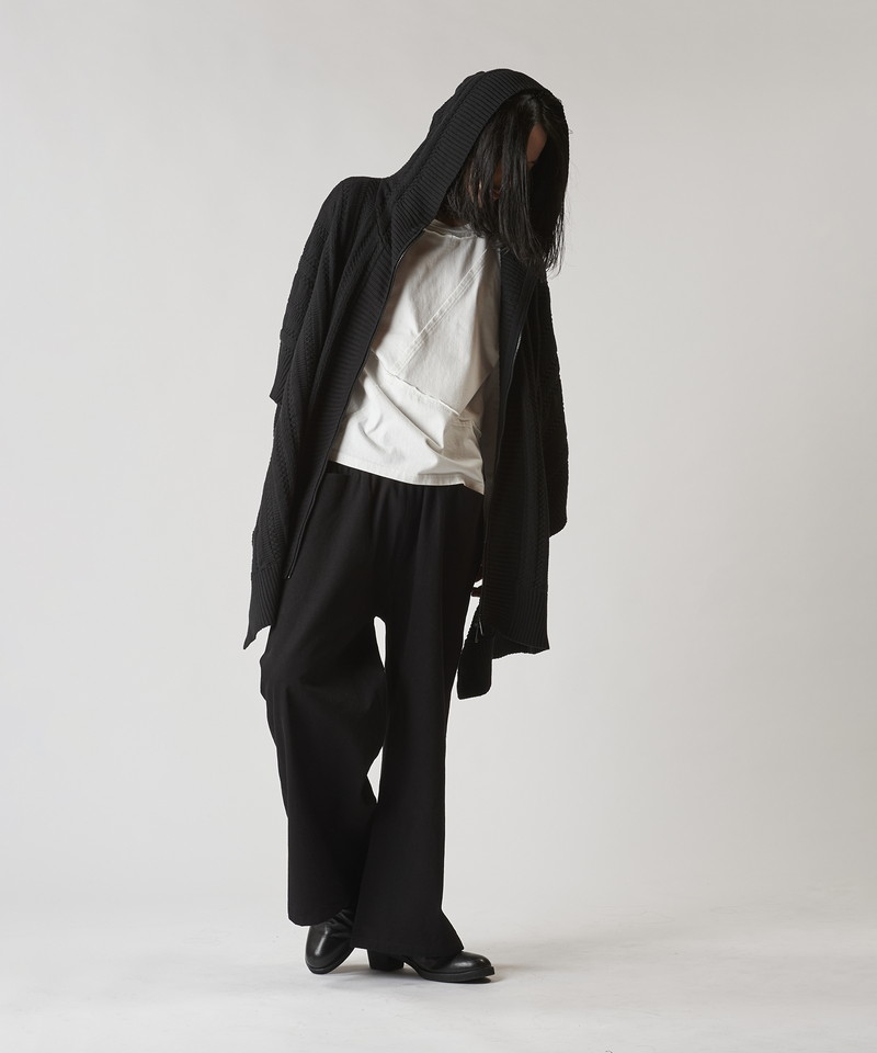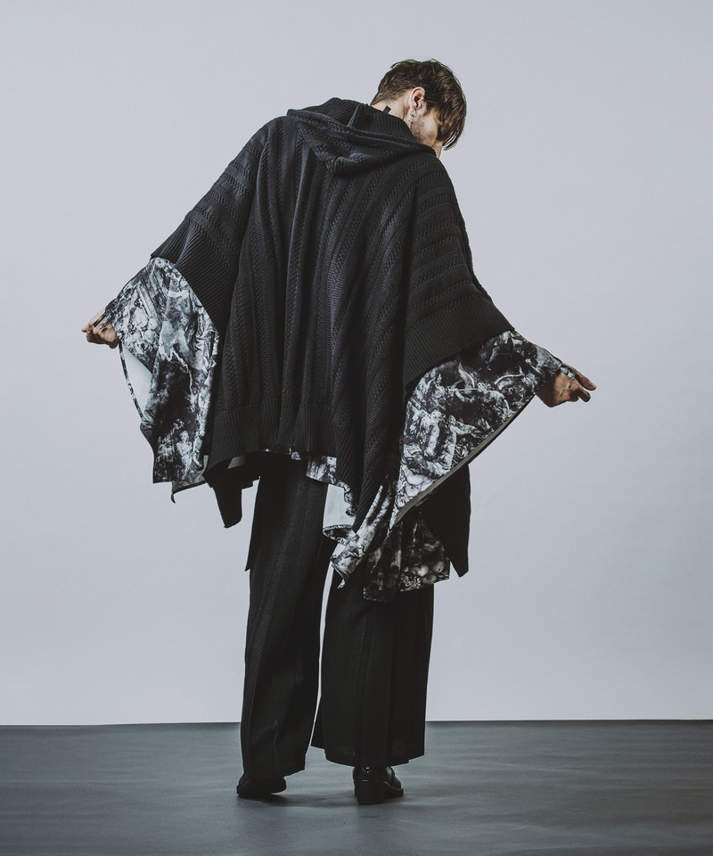 ZIPアップタイプのニットポンチョ。ビッグフードデザインとボリューム感のあるビッグシルエット。あえて横使いでストライプ調にしてシャープな印象をプラスした立体感のある模様編みが特徴。ヘムラインや、ファスナー、フード周りはリブ編みに切替えたデザイン。スタイリングアレンジ可能なダブルファスナー。ジェンダーレスでモードなデザイン。定番人気のシックなBLACKと2色の糸を引き揃えて編み立てたBLACK×WHITEの2カラー展開。