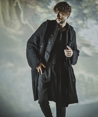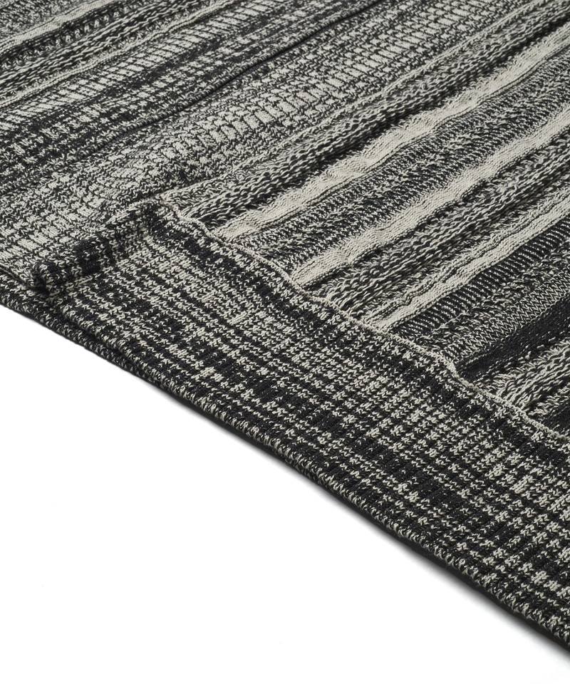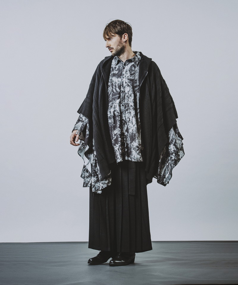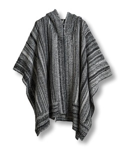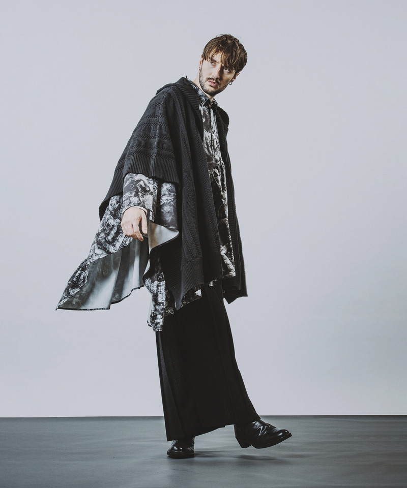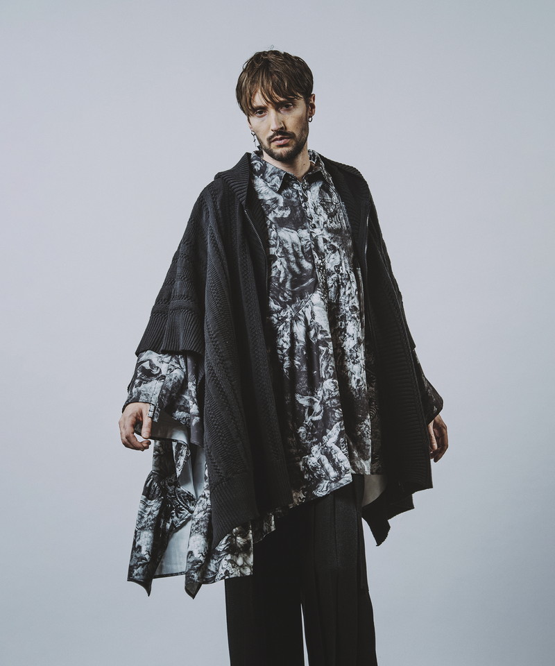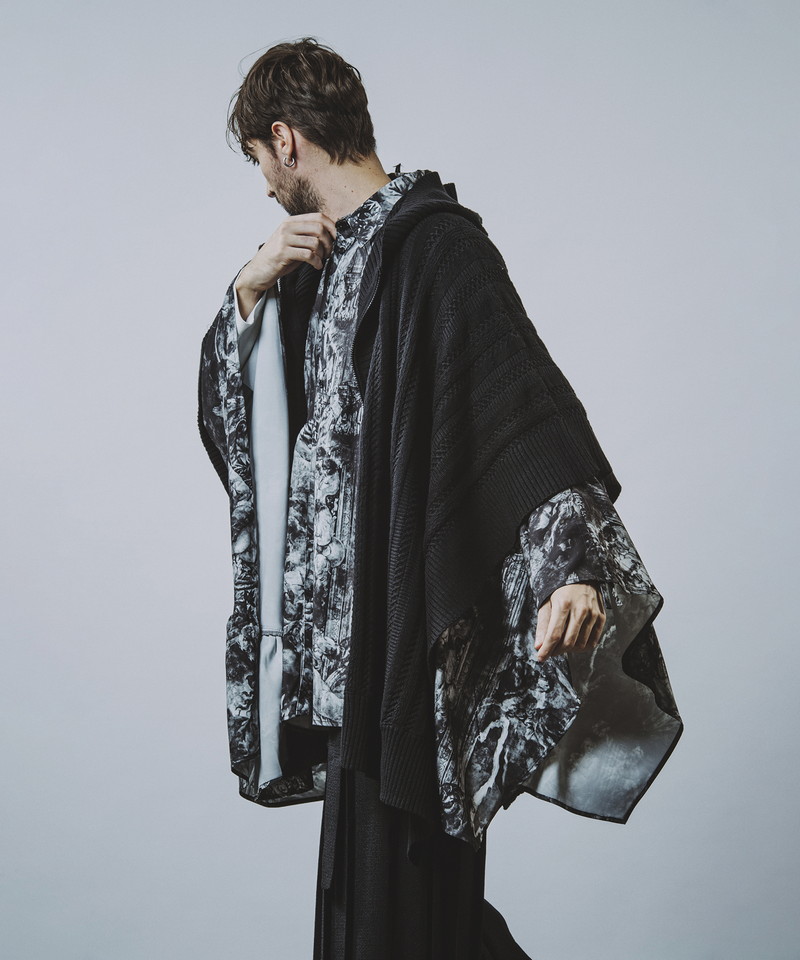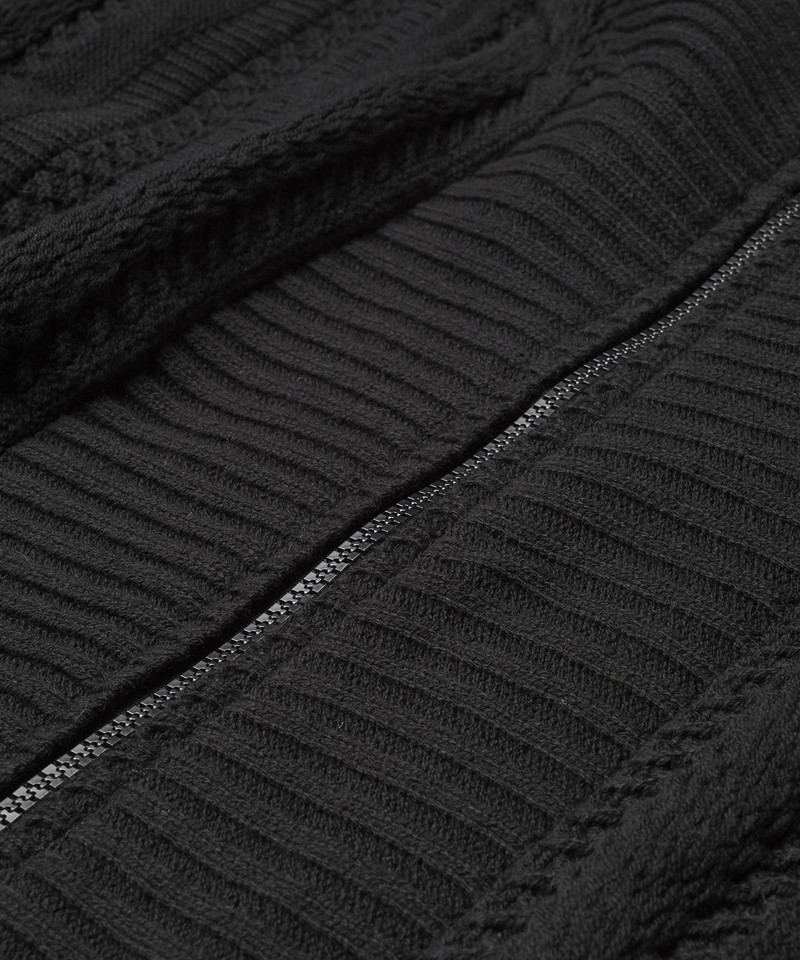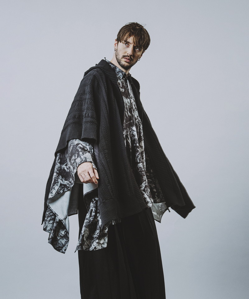 ZIPアップタイプのニットポンチョ。ビッグフードデザインとボリューム感のあるビッグシルエット。あえて横使いでストライプ調にしてシャープな印象をプラスした立体感のある模様編みが特徴。ヘムラインや、ファスナー、フード周りはリブ編みに切替えたデザイン。スタイリングアレンジ可能なダブルファスナー。ジェンダーレスでモードなデザイン。定番人気のシックなBLACKと2色の糸を引き揃えて編み立てたBLACK×WHITEの2カラー展開。