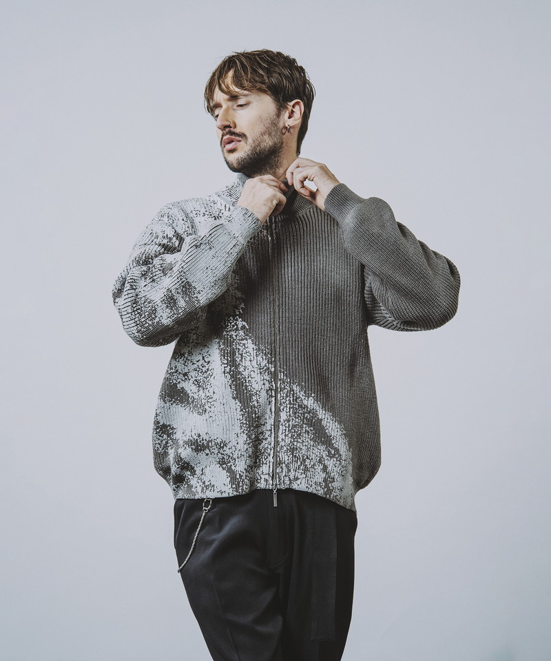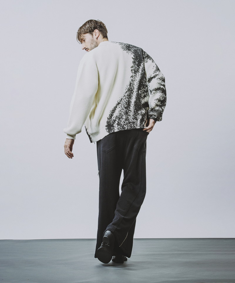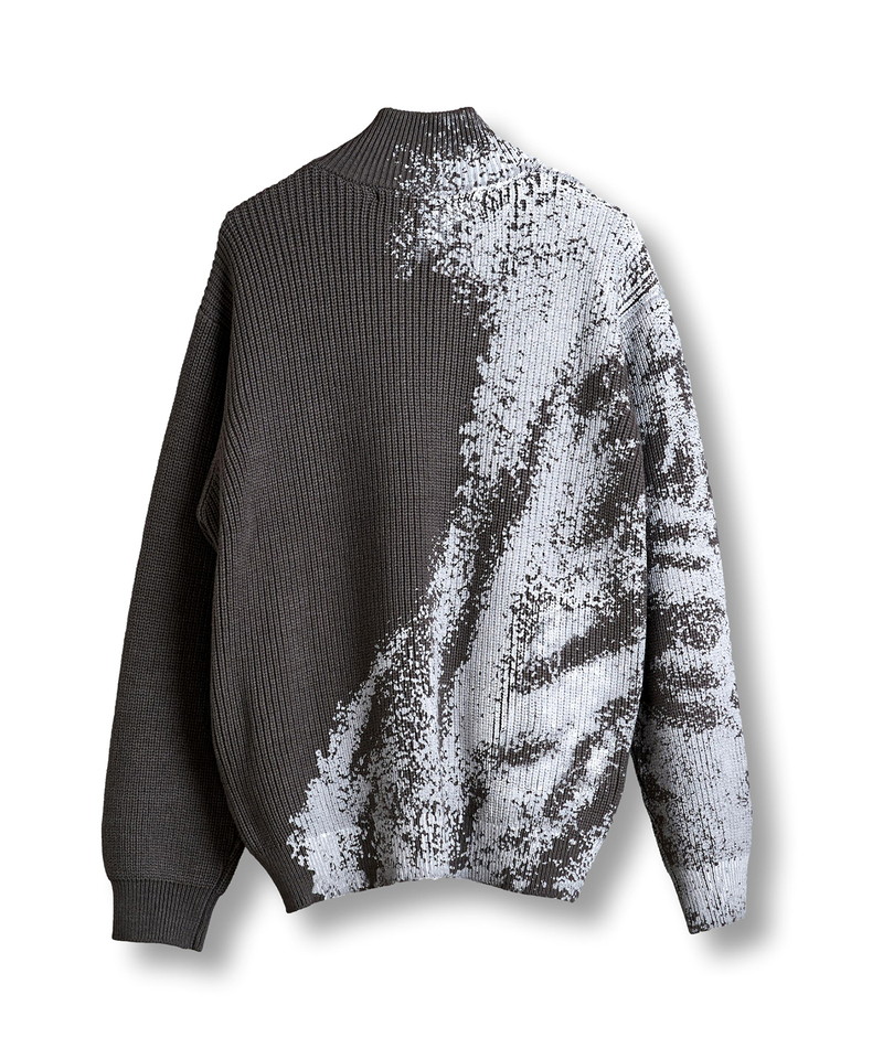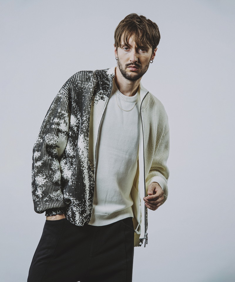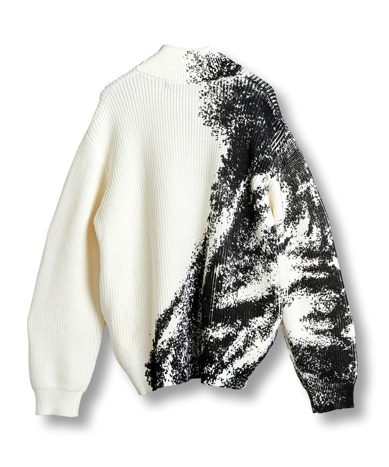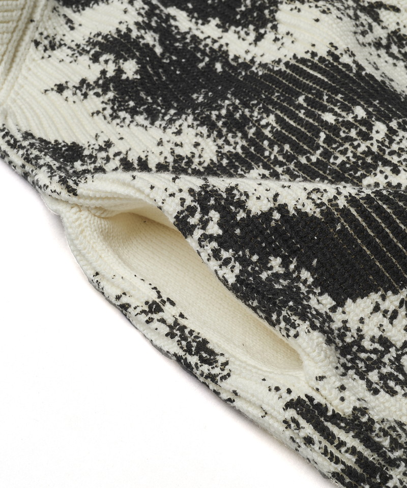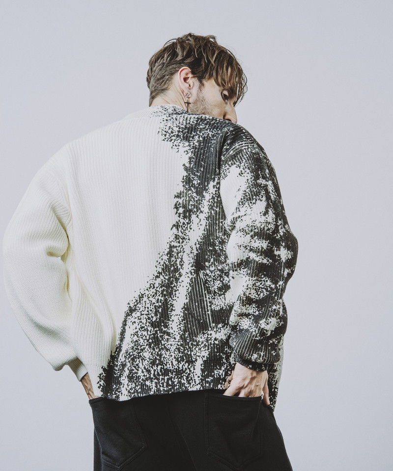 身頃の編み地には畦編みを採用、凹凸感のある編み地にプリントすることで、自然なムラ感を演出