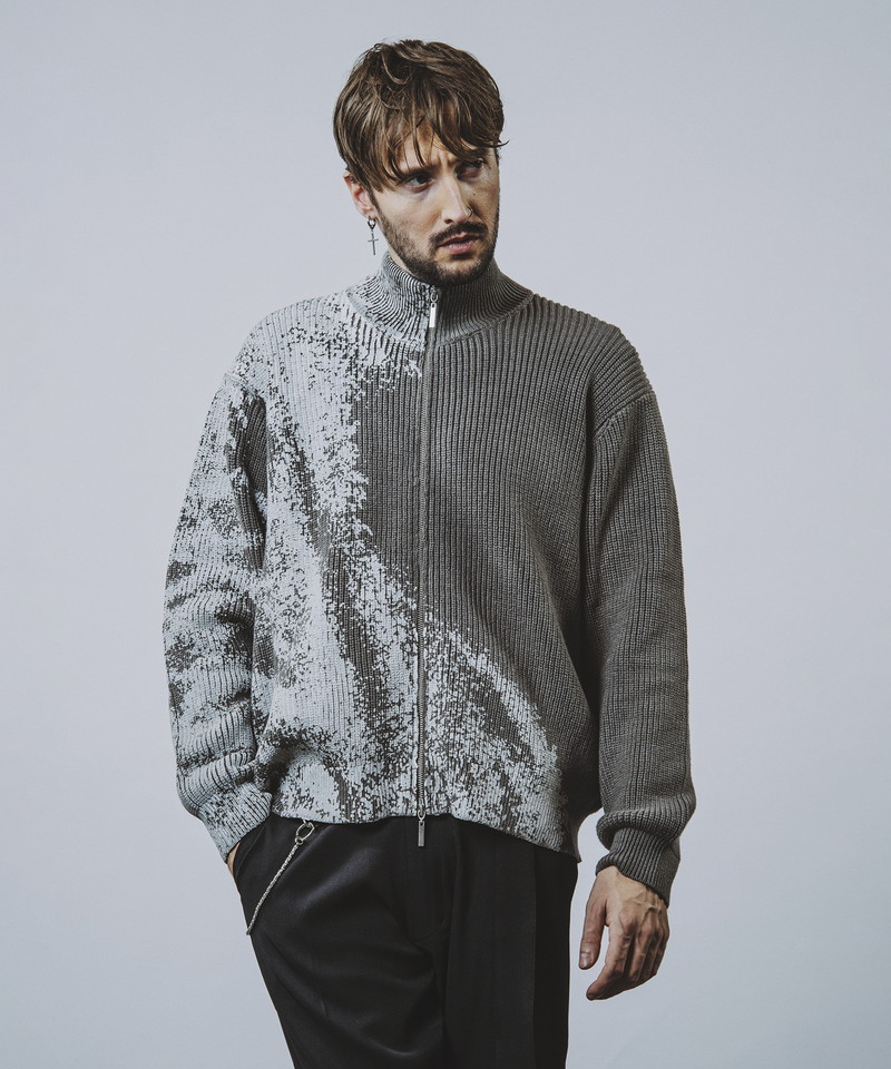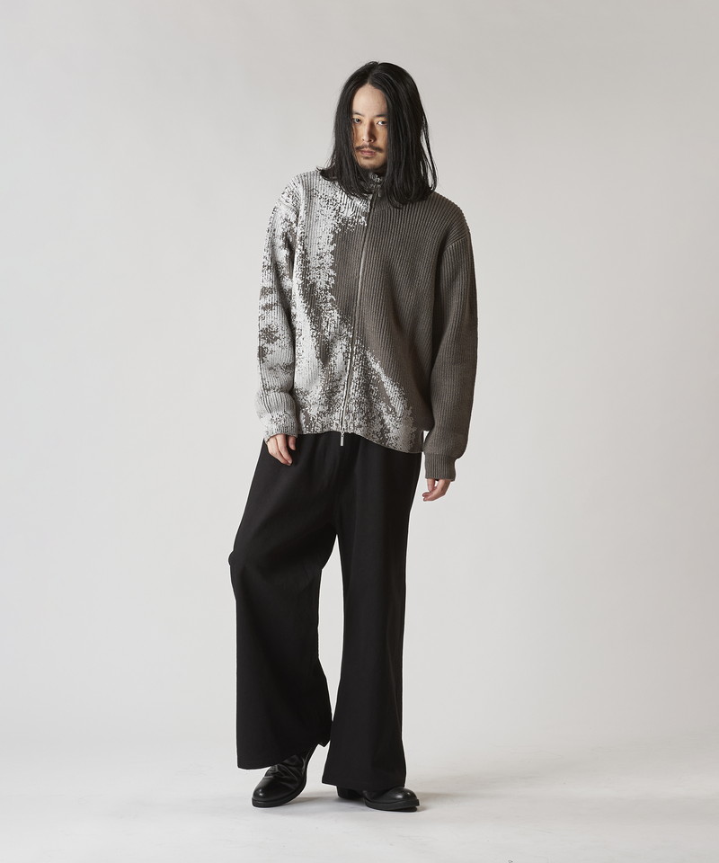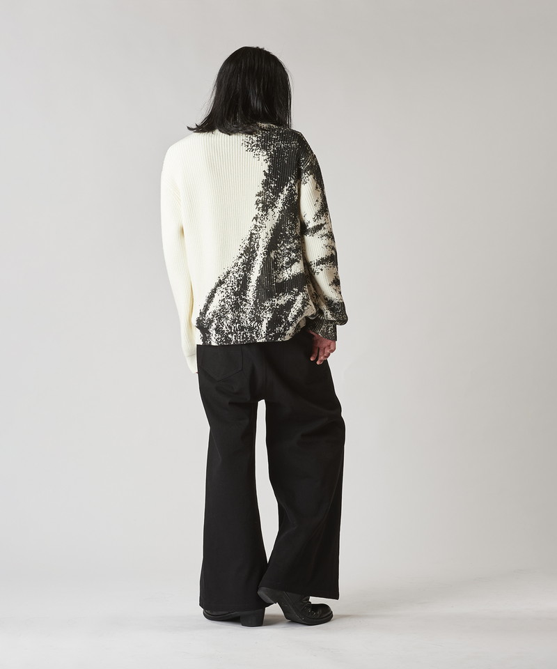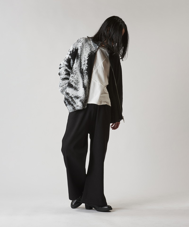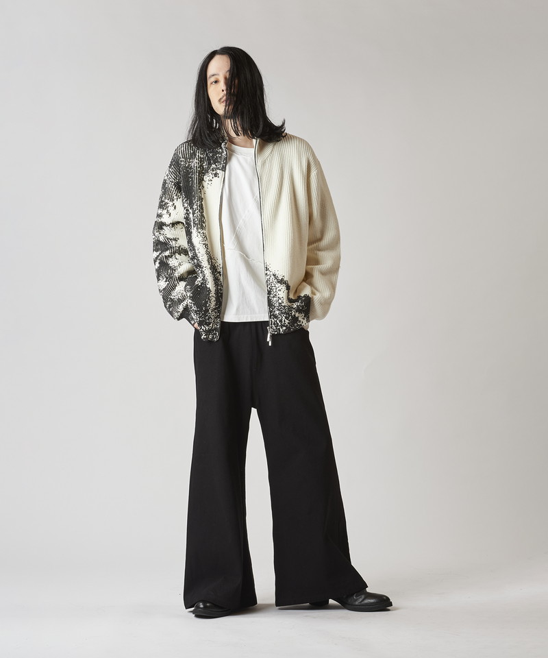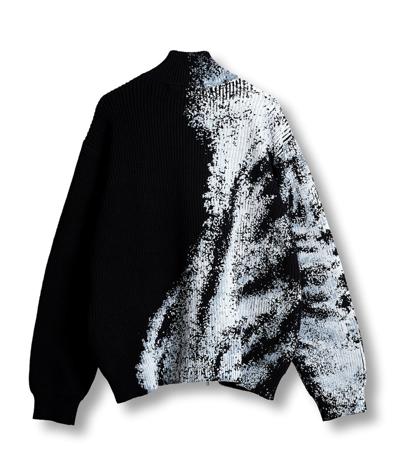 身頃の編み地には畦編みを採用、凹凸感のある編み地にプリントすることで、自然なムラ感を演出