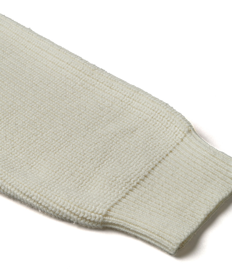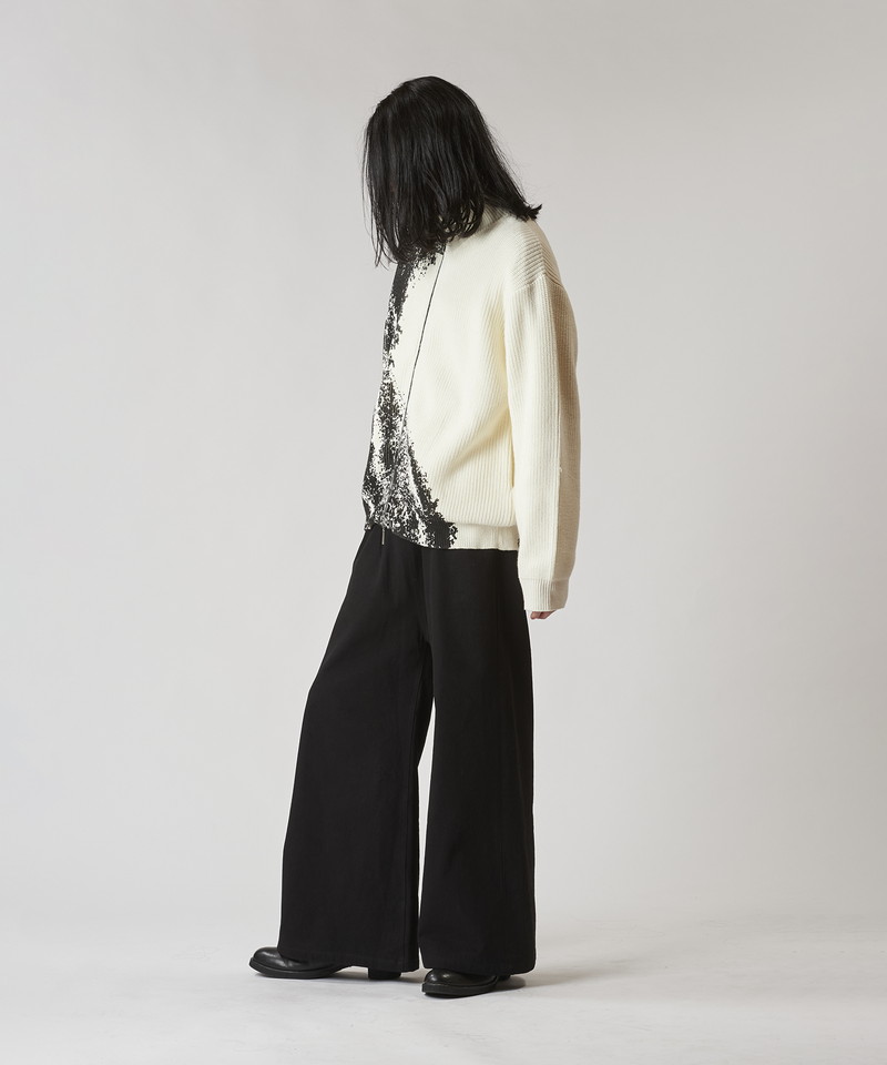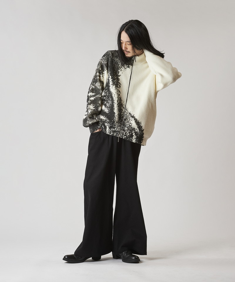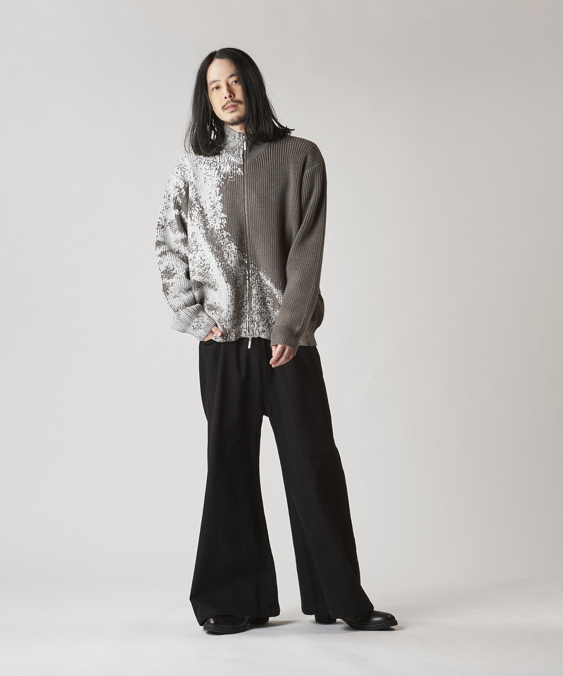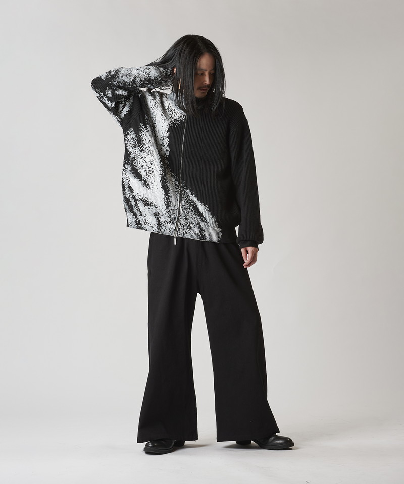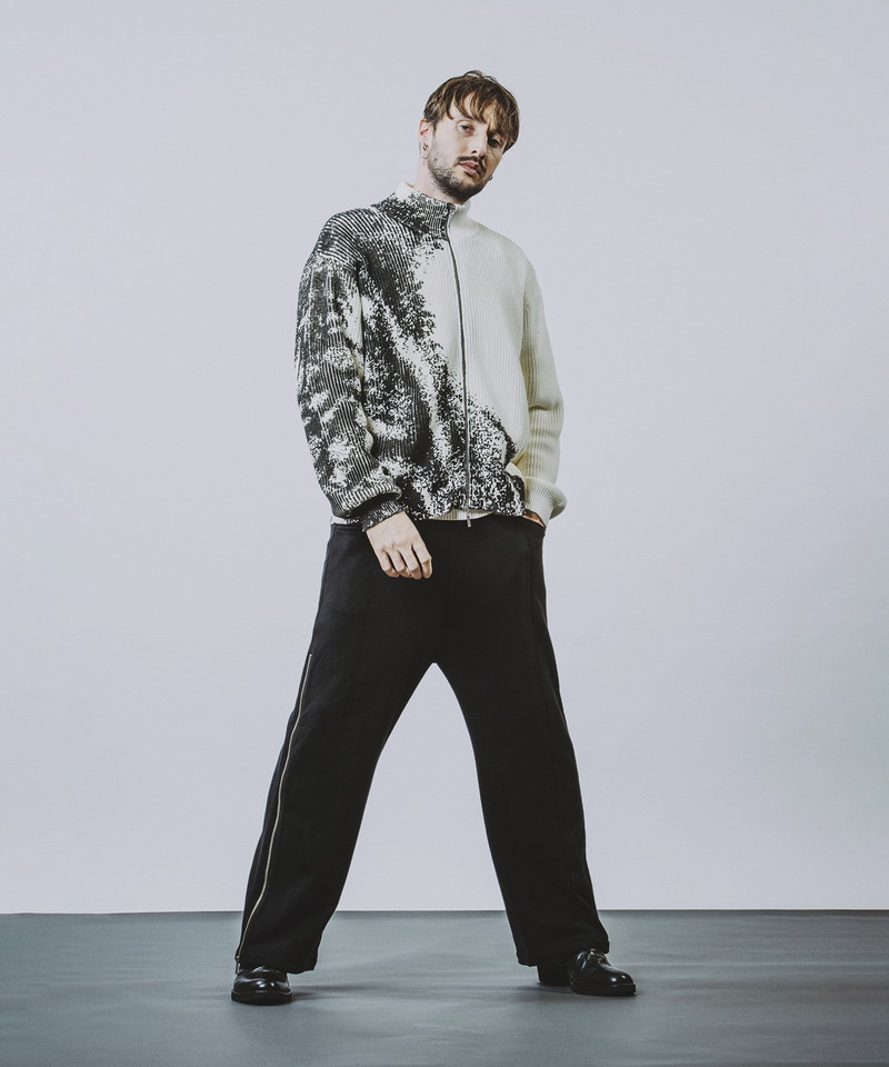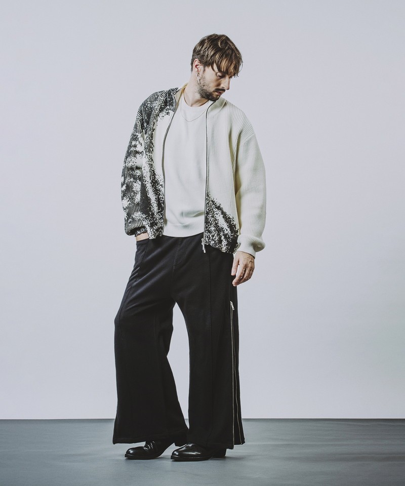 身頃の編み地には畦編みを採用、凹凸感のある編み地にプリントすることで、自然なムラ感を演出