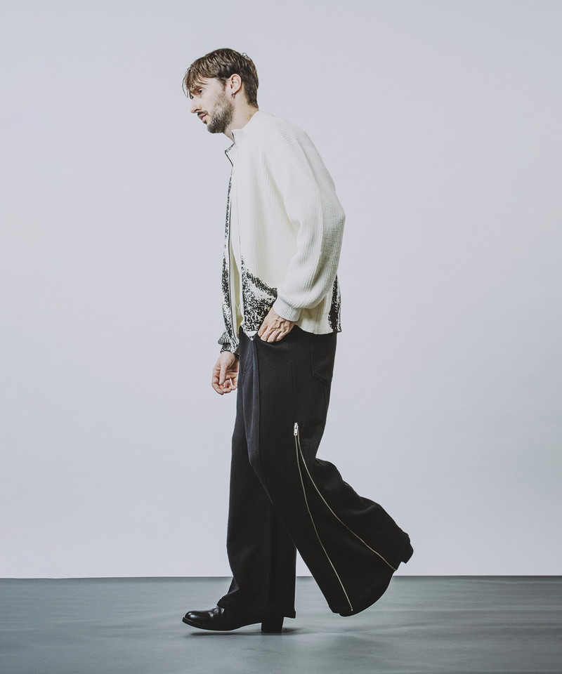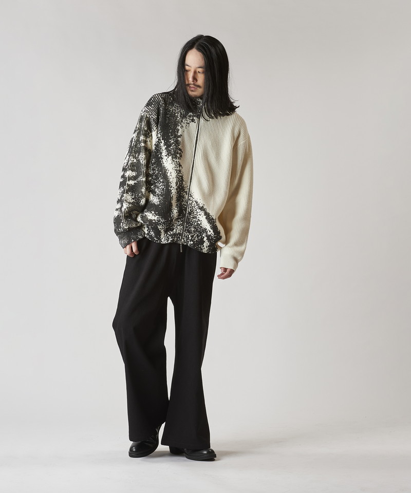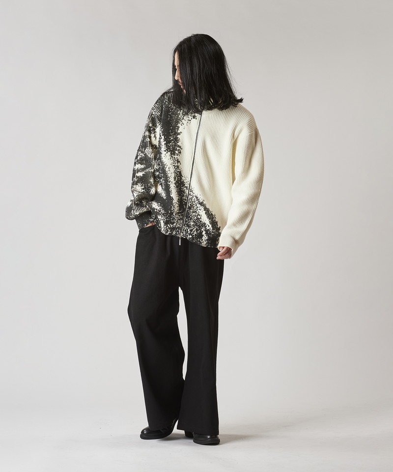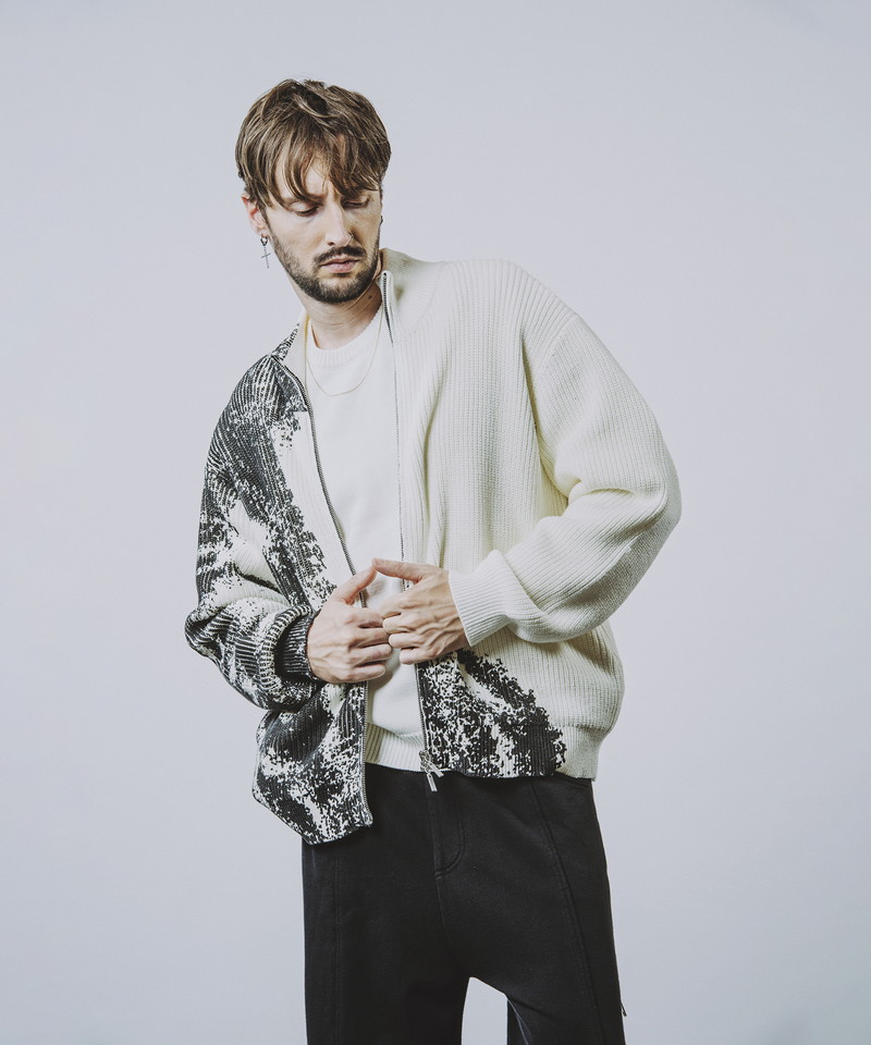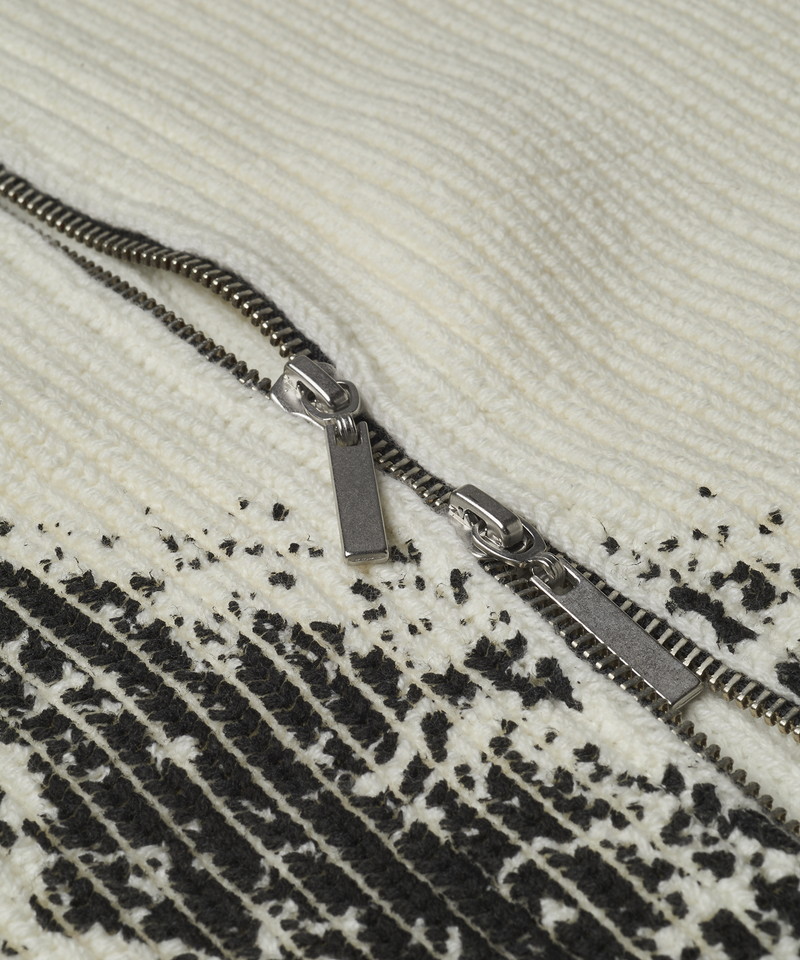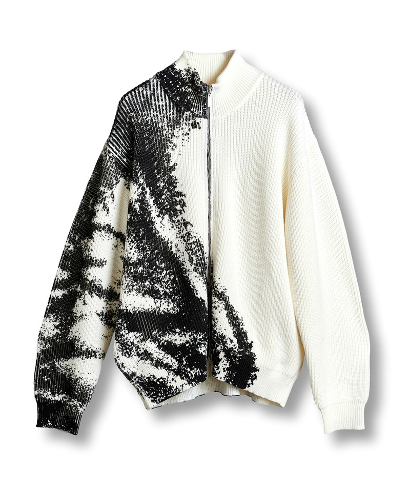 ファスナーを横断するように両身頃にプリントされた個性的なデザイン