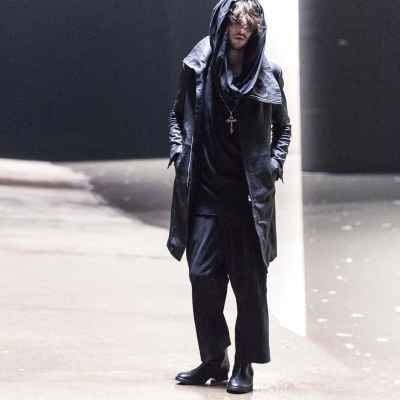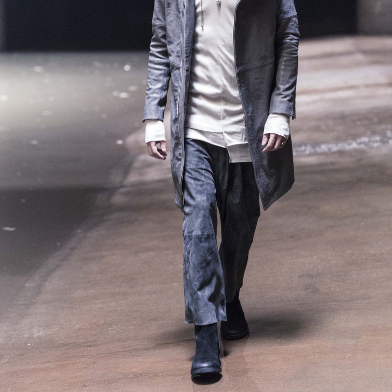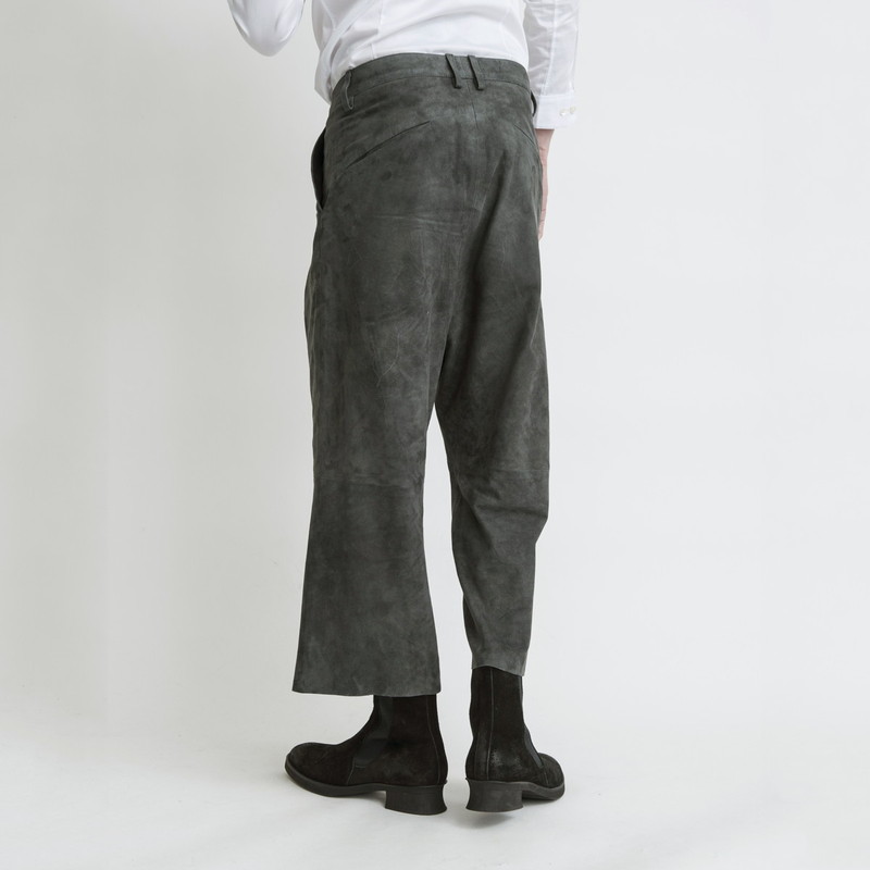 従来はスムースレザーが多いレザーパンツにゴートレザーのスゥエードを使いマットな質感による変化も個性を感じさせる一本となっている。