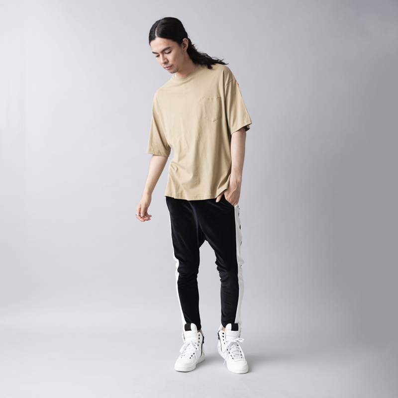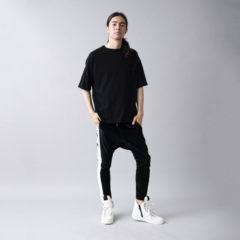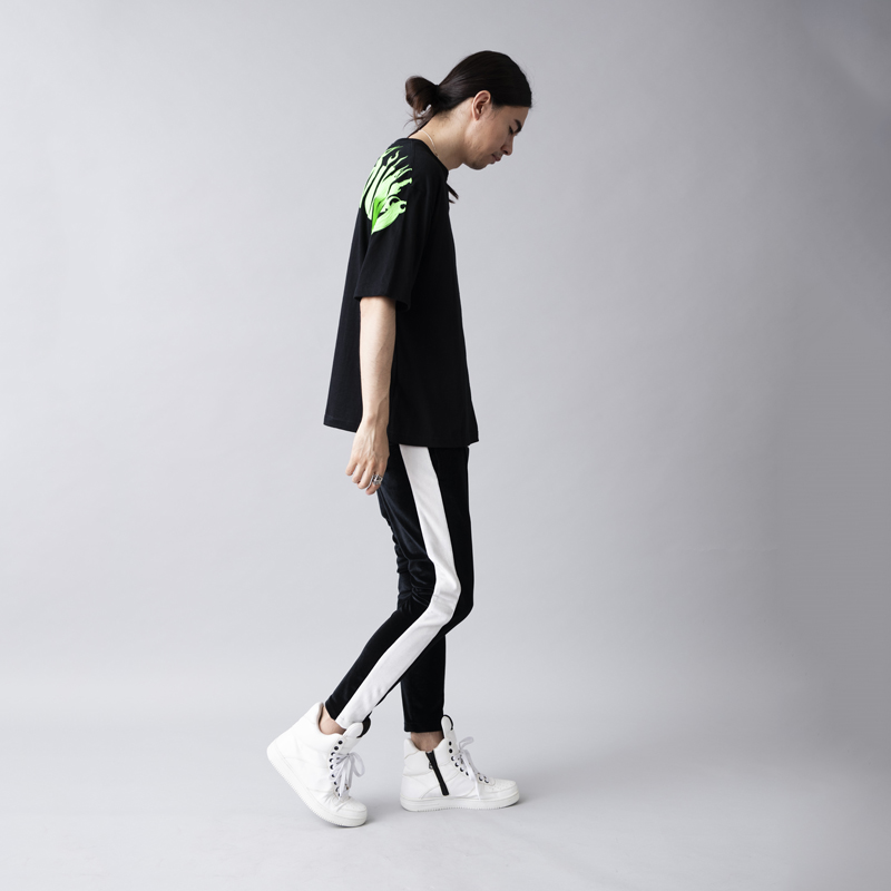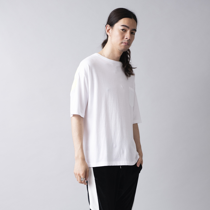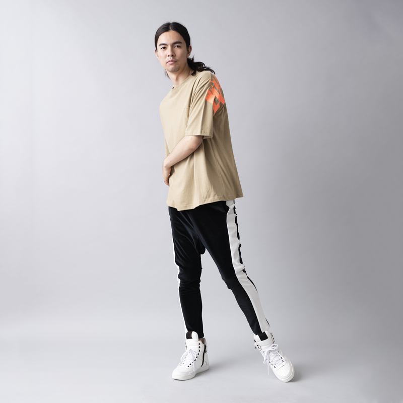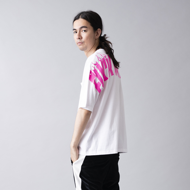 ビッグシルエットなボディをベースに大胆なバックプリントを主張が効いた一枚。左袖から右袖まで繋がっている「FUCK AROUND」のメッセージはラバープリントの上から発泡剤を混ぜたラバーインクを使い手作業で文字をなぞりフレイムスパターンを描いた拘りのプリント。単体使いから季節の変わり目はインナーにロンTやシャツを使ったストリートなレイヤードスタイルも楽しめるアイテムとなっている。