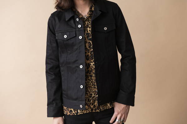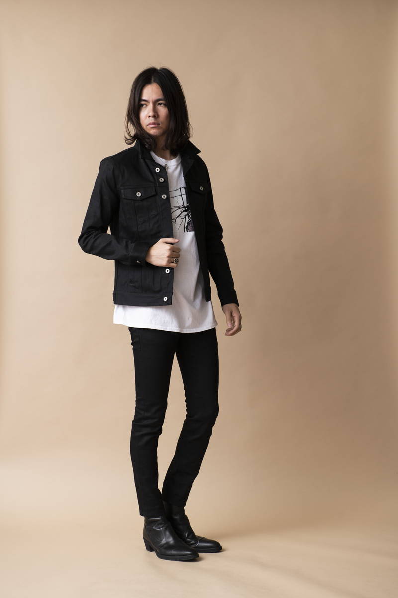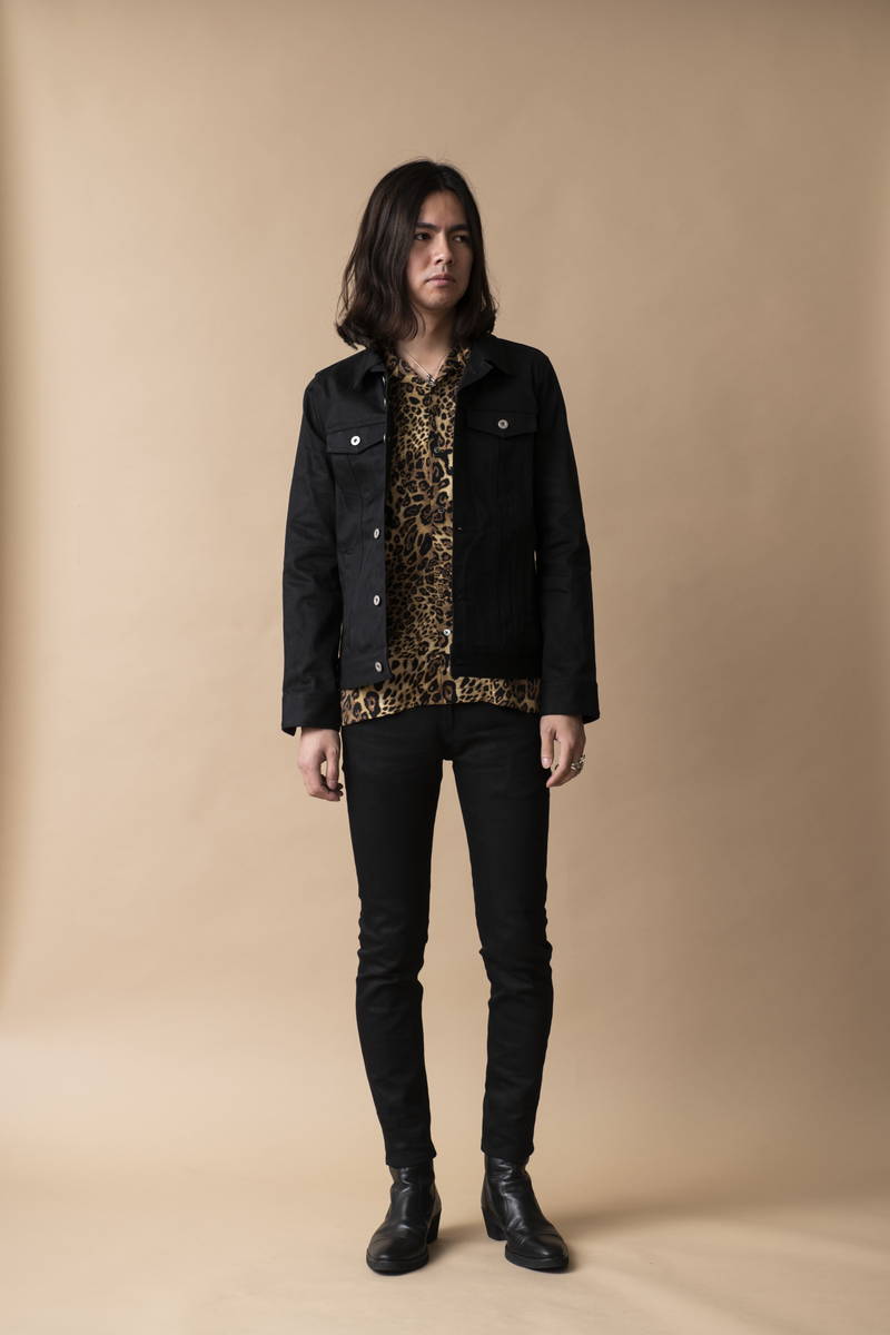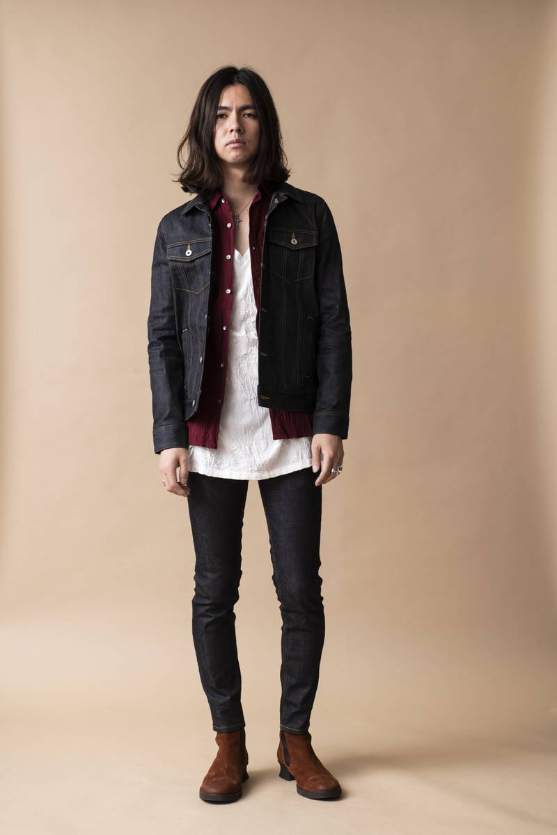 今年も継続して人気のオープンカラーシャツを挟み開放感のある襟元でシャツスタイルでも 堅苦しくない印象の着こなし。デニムとステッチを黒で統一する事で全体が引き締まり カジュアルさを払拭。ロックな匂いを感じるスタイルに仕上げている。
