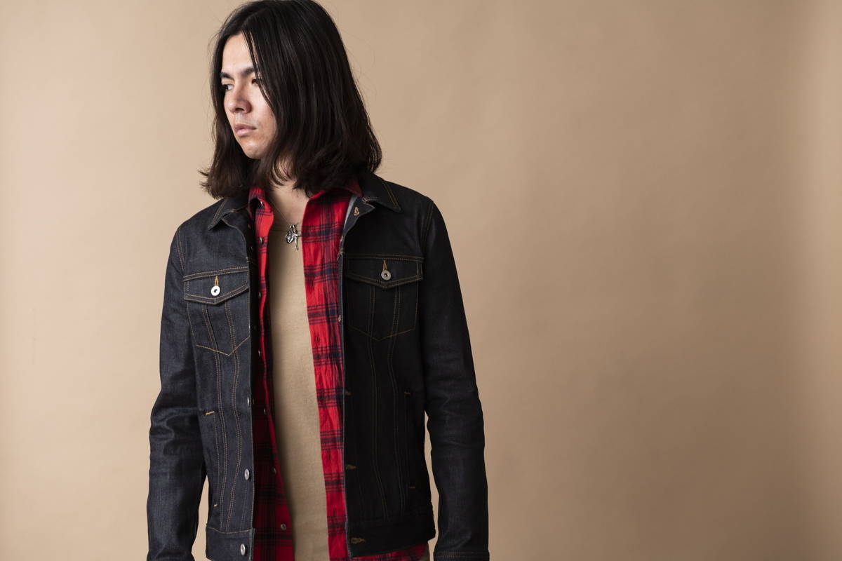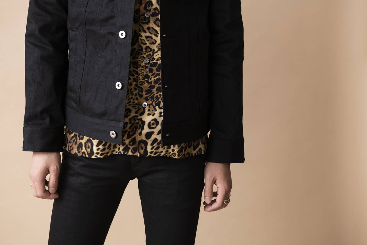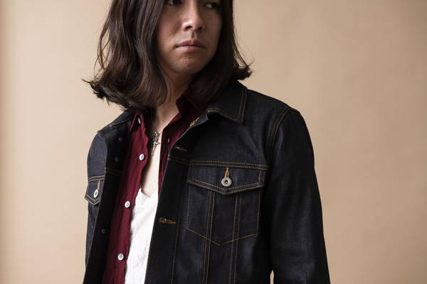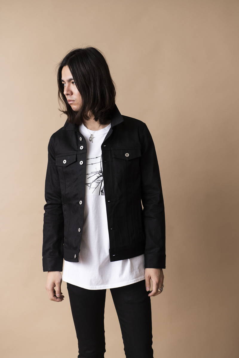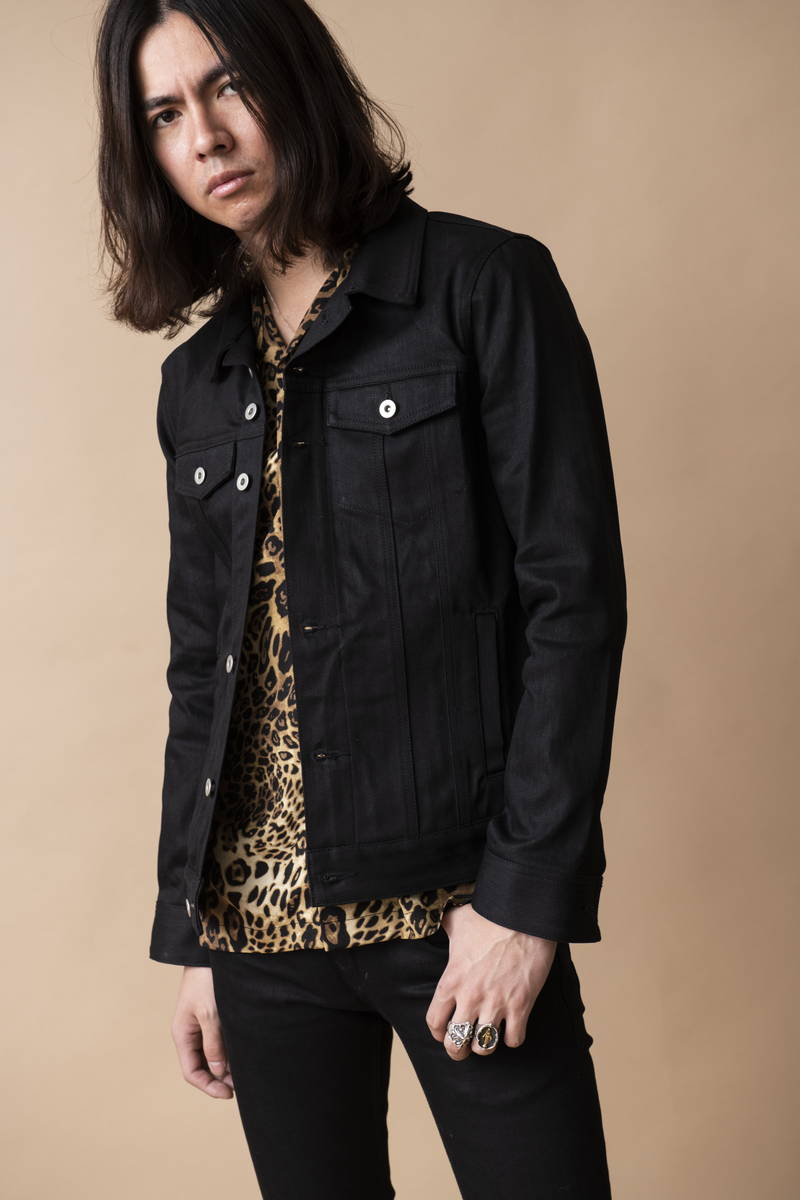 今年も継続して人気のオープンカラーシャツを挟み開放感のある襟元でシャツスタイルでも 堅苦しくない印象の着こなし。デニムとステッチを黒で統一する事で全体が引き締まり カジュアルさを払拭。ロックな匂いを感じるスタイルに仕上げている。