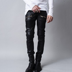 コーティング処理を施したライダースパンツで艶感をコートはスウェードタッチでマットな質感を楽しむ。