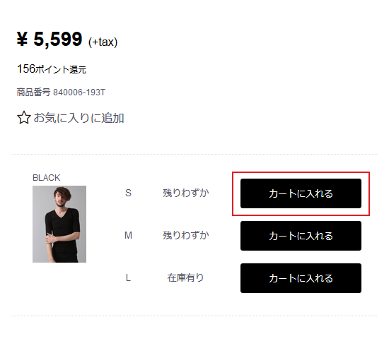 欲しい商品が見つかったらサイズ・カラーを選択し「カートに入れる」ボタンをクリックしてください。